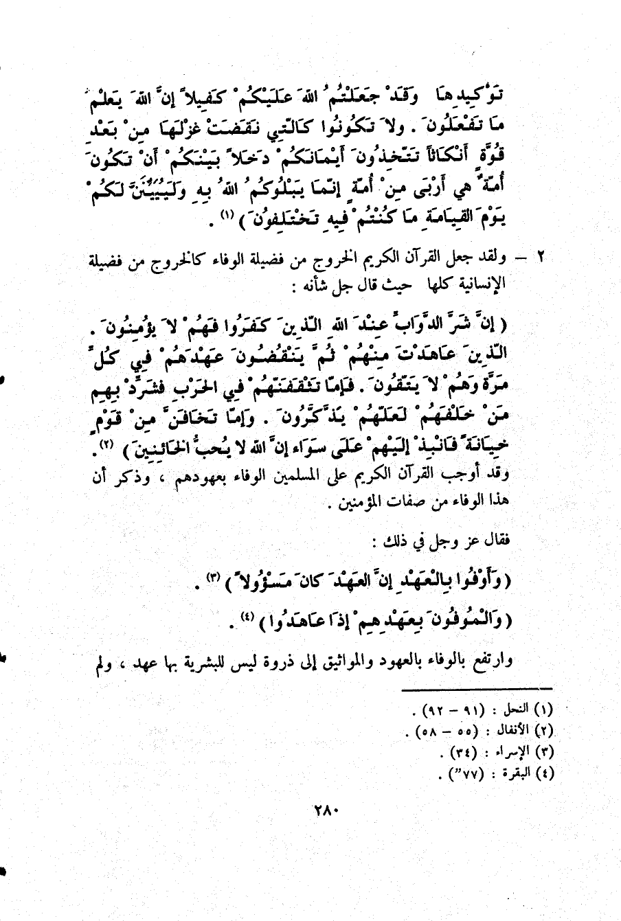 2- ولقد جعل القرآن الكريم الخروج من فضيلة الوفاء كالخروج من فضيلة الإنسانية كلها حيث قال جل شأنه: