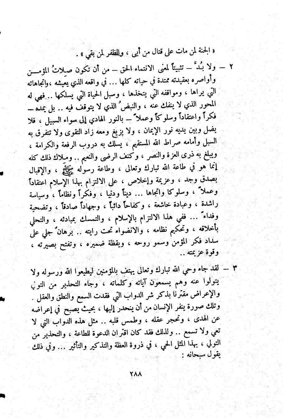 2- ولا بُدَّ -تثبيتًا لمعنى الانتماء الحق- من أن تكون صلات المؤمن وأواصره بعقيدته ممتدة في حياته كلها.. في واقعه الذي يعيشه، واتجاهاته التي يراها، ومواقفه التي يتخذها، وسبل الحياة التي يسلكها، فهي له المحور الذي لا ينفك عنه، والنبضُ الذي لا يتوقف فيه، بل يمده -فكرًا واعتقادًا وسلوكًا وعملاً- بالنور الهادي إلى سواء السبيل، فلا يضل وبين يديه نور الإيمان، ولا يزيغ ومعه زاد التقوى ولا تتفرق به السبل وأمامه صراط الله المستقيم، يسلك به دروب الرفعة والكرامة، ويبلغ به ذرى العزة والنصر، وكنف الرضى والنعيم، وملاك ذلك كله إنما هو في طاعة الله تبارك وتعالى، وطاعة رسوله -صلى الله عليه وسلم- والإقبال بصدق وجد، وعزيمة وإخلاص، على الالتزام بهذا الإسلام اعتقادًا وعملاً، وسلوكا واتجاها، دينًا ودنيا، وفكرًا ونظامًا، وسياسة راشدة، وعبادة خاشعة، وكفاحًا دائبًا، وجهادًا صادقًا، وتضحية وفداء، ففي هذا الالتزام بالإسلام، والتمسك بمبادئه، والتحلي بأخلاقه، وتحكيم نظامه، والانضواء تحت رايته، برهان جلي على سداد فكر المؤمن وسمو روحه، ويقظة ضميره، وتفتح بصيرته، وقوة عزيمته.