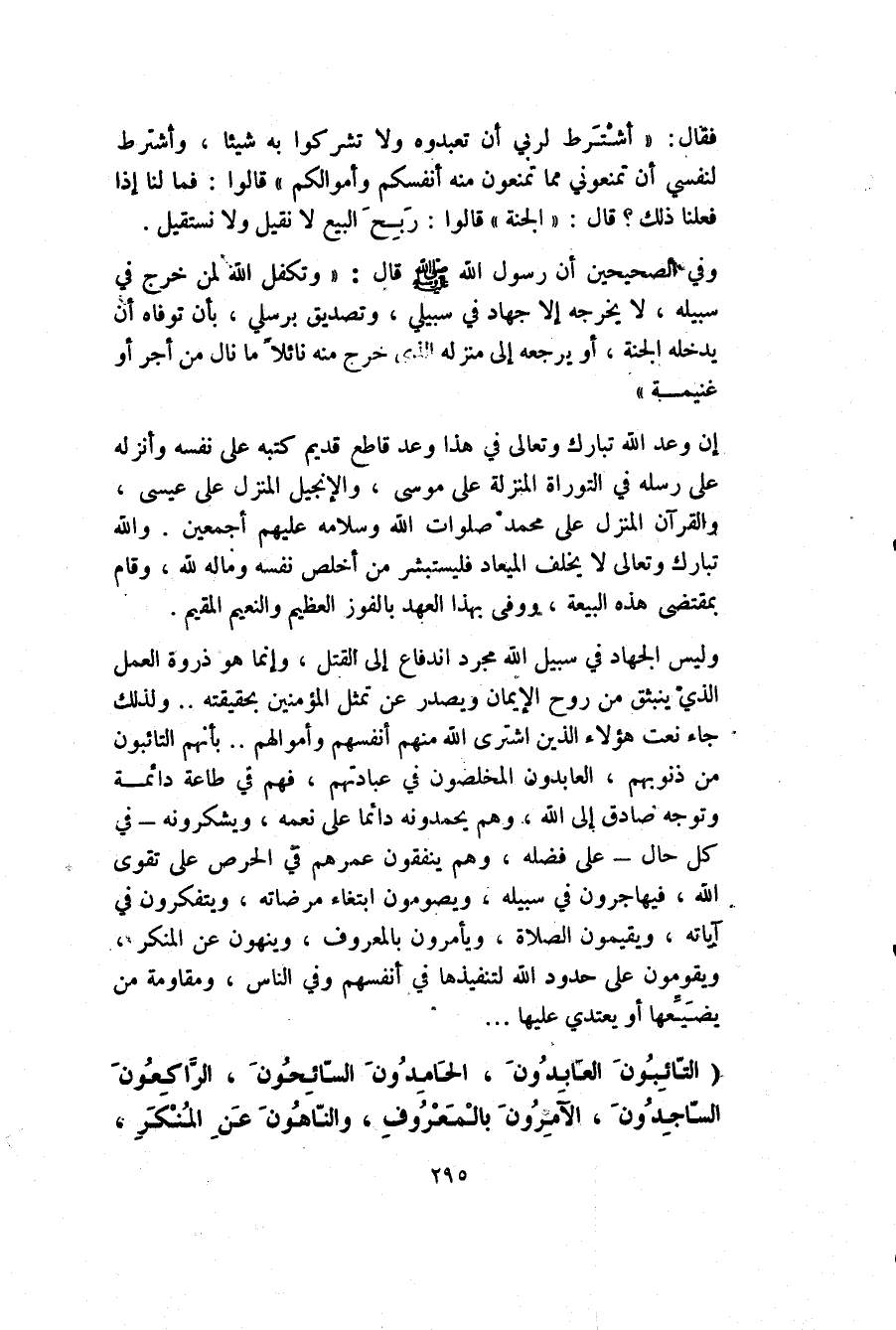 وليس الجهاد في سبيل الله مجرد اندفاع إلى القتل؛ وإنما هو ذروة العمل الذي ينبثق من روح الإيمان ويصدر عن تمثل المؤمنين بحقيقته، ولذلك جاء نعت هؤلاء الذين اشترى الله منهم أنفسهم وأموالهم.. بأنهم التائبون من ذنوبهم، العابدون المخلصون في عبادتهم، فهم في طاعة دائمة وتوجه صادق إلى الله، وهم يحمدونه دائمًا على نعمه، ويشكرونه في كل حال على فضله، وهم ينفقون عمرهم في الحرص على تقوى الله، فيهاجرون في سبيله، ويصومون ابتغاء مرضاته، ويتفكرون في آياته، ويقيمون الصلاة، ويأمرون بالمعروف، وينهون عن المنكر، ويقومون على حدود الله؛ لتنفيذها في أنفسهم وفي الناس، ومقاومة من يضَيِّعها أو يعتدى عليها.
