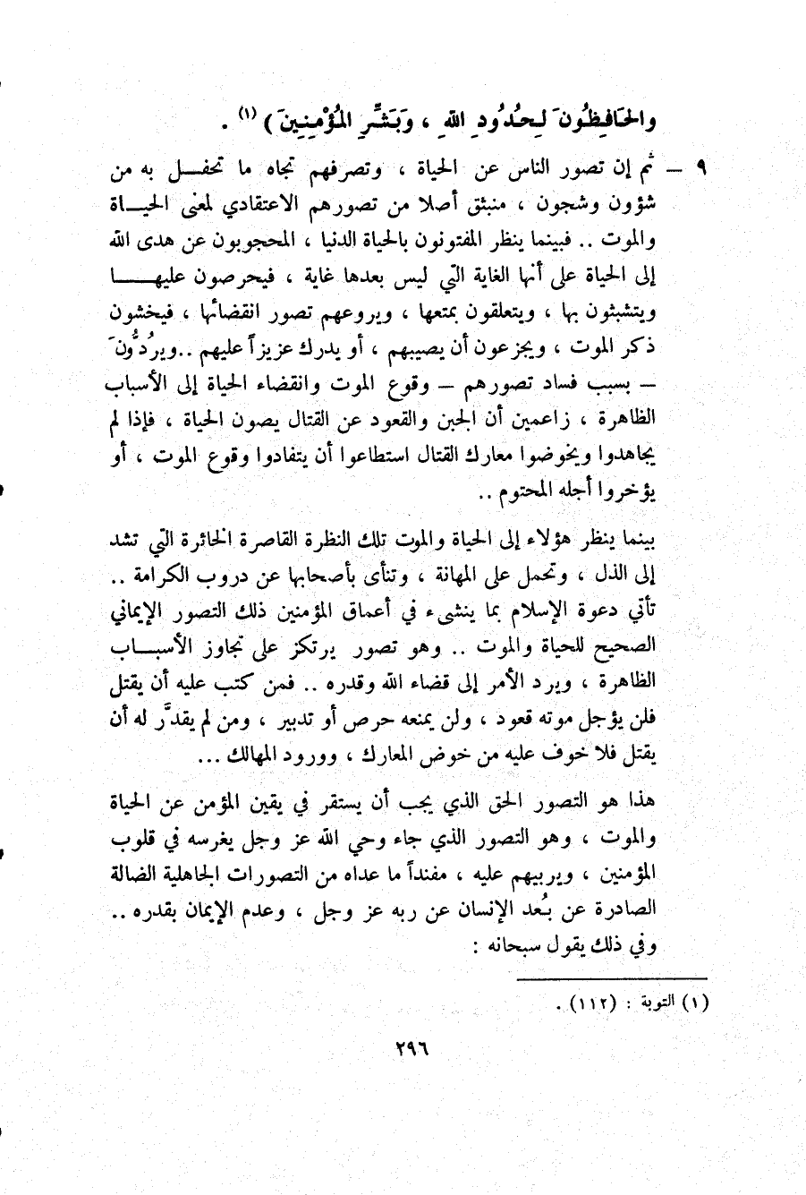 9- ثم إن تصور الناس عن الحياة، وتصرفهم تجاه ما تحفل به من شئون وشجون، منبثق أصلًا من تصورهم الاعتقادي لمعنى الحياة والموت، فبينما ينظر المفتونون بالحياة الدنيا، المحجوبون عن هدى الله إلى الحياة على أنها الغاية التي ليس بعدها غاية، فيحرصون عليها ويتشبثون بها، ويتعلقون بمتعها، ويروعهم تصور انقضائها، فيخشون ذكر الموت، ويجزعون أن يصيبهم، أو يدرك عزيزًا عليهم، ويرُدُّونَ -بسبب فساد تصورهم- وقوع الموت وانقضاء الحياة إلى الأسباب الظاهرة، زاعمين أن الجبن والقعود عن القتال يصون الحياة، فإذا لم يجاهدوا ويخوضوا معارك القتال استطاعوا أن يتفادوا وقوع الموت، أو يؤخروا أجله المحتوم.