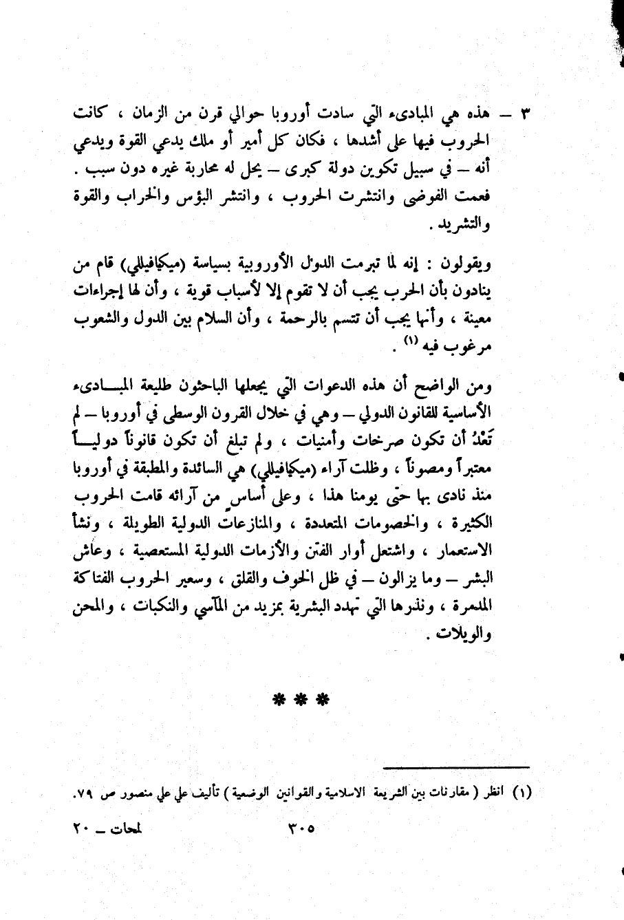 ومن الواضح أن هذه الدعوات التي يجعلها الباحثون طليعة المبادئ الأساسية للقانون الدولي -وهي في خلال القرون الوسطى في أوروبا- لم تَعْد أن تكون صرخات وأمنيات، ولم تبلغ أن تكون قانونًا دوليًا معتبرًا ومصونًا، وظلت آراء "ميكيافيللي" هي السائدة والمطبقة في أروربا منذ نادى بها حتى يومنا هذا، وعلى أساسٍ من آرائه قامت الحروب الكثيرة، والخصومات المتعددة، والمنازعات الدولية الطويلة، ونشأ الاستعمار، واشتعل أُوَار الفتن والأزمات الدولية المستعصية، وعاش البشر -وما يزالون- في ظل الخوف والقلق، وسعير الحروب الفتاكة المدمرة، ونذرها التي تهدد البشرية بمزيد من المآسي والنكبات، والمحن والويلات.