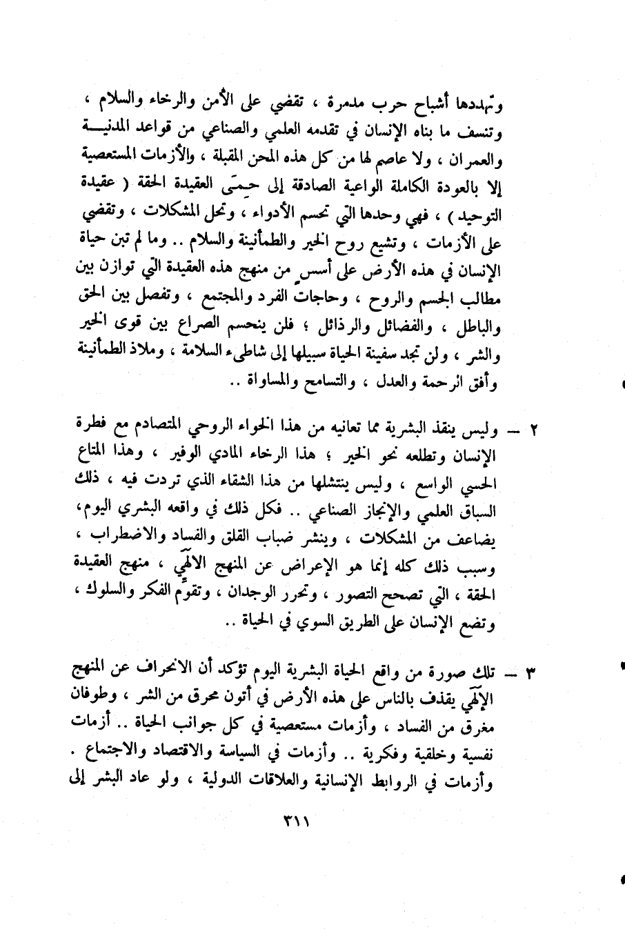 2- وليس ينقذ البشرية مما تعانيه من هذا الخواء الروحي المتصادم مع فطرة الإنسان وتطلعه نحو الخير؛ هذا الرخاء المادي الوفير، وهذا المتاع الحسي الواسع، وليس ينتشلها من هذا الشقاء الذي تردت فيه ذلك السباق العلمي والإنجاز الصناعي..؛ فكل ذلك في واقعه البشري اليوم يضاعف من المشكلات، وينشر ضباب القلق والفساد والاضطراب، وسبب ذلك كله إنما هو الإعراض عن المنهج الإلهي، منهج العقيدة الحقة، التي تصحح التصور، وتحرر الوجدان، وتقوِّم الفكر والسلوك، وتضع الإنسان على الطريق السوي في الحياة..