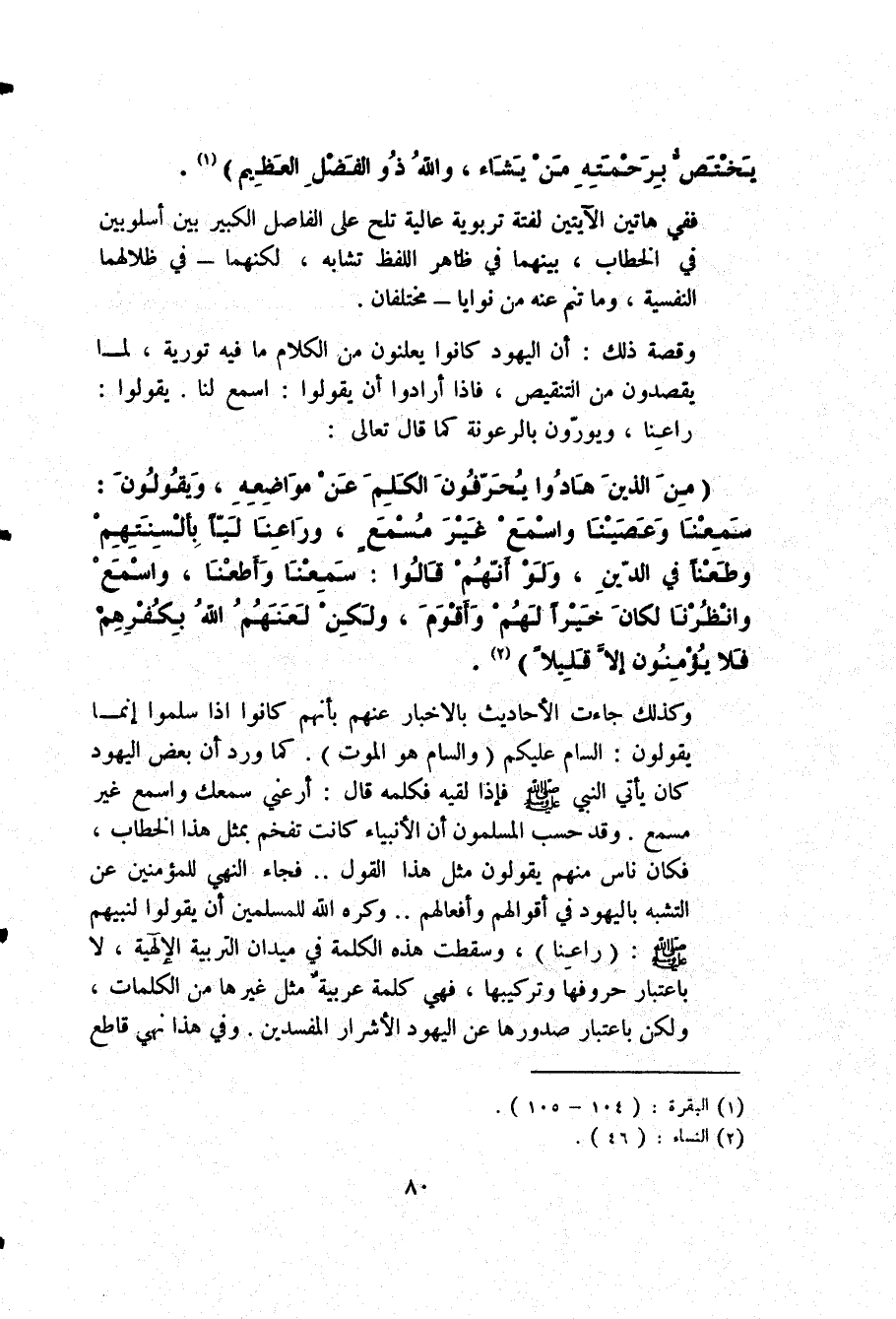وكذلك جاءت الأحاديث بالإخبار عنهم بأنهم كانوا إذا سلموا إنما يقولون: السام عليكم "والسام هو الموت". كما ورد أن بعض اليهود كان يأتي النبي صلى الله عليه وسلم، فإذا لقيه فكلمه قال: أرعني سمعك واسمع غير مسمع. وقد حسب المسلمون أن الأنبياء كانت تفخم بمثل هذا الخطاب. فكان ناس منهم يقولون مثل هذا القول؛ فجاء النهي للمؤمنين عن التشبه باليهود في أقوالهم وأفعالهم، وكره الله للمسلمين أن يقولوا لنبيهم صلى الله عليه وسلم: "راعنا"، وسقطت هذه الكلمة في ميدان التربية الإلهية؛ لا باعتبار حروفها وتركيبها؛ فهي كلمة عربية مثل غيرها من الكلمات؛ ولكن باعتبار صدورها عن اليهود الأشرار المفسدين. وفي هذا نهي قاطع