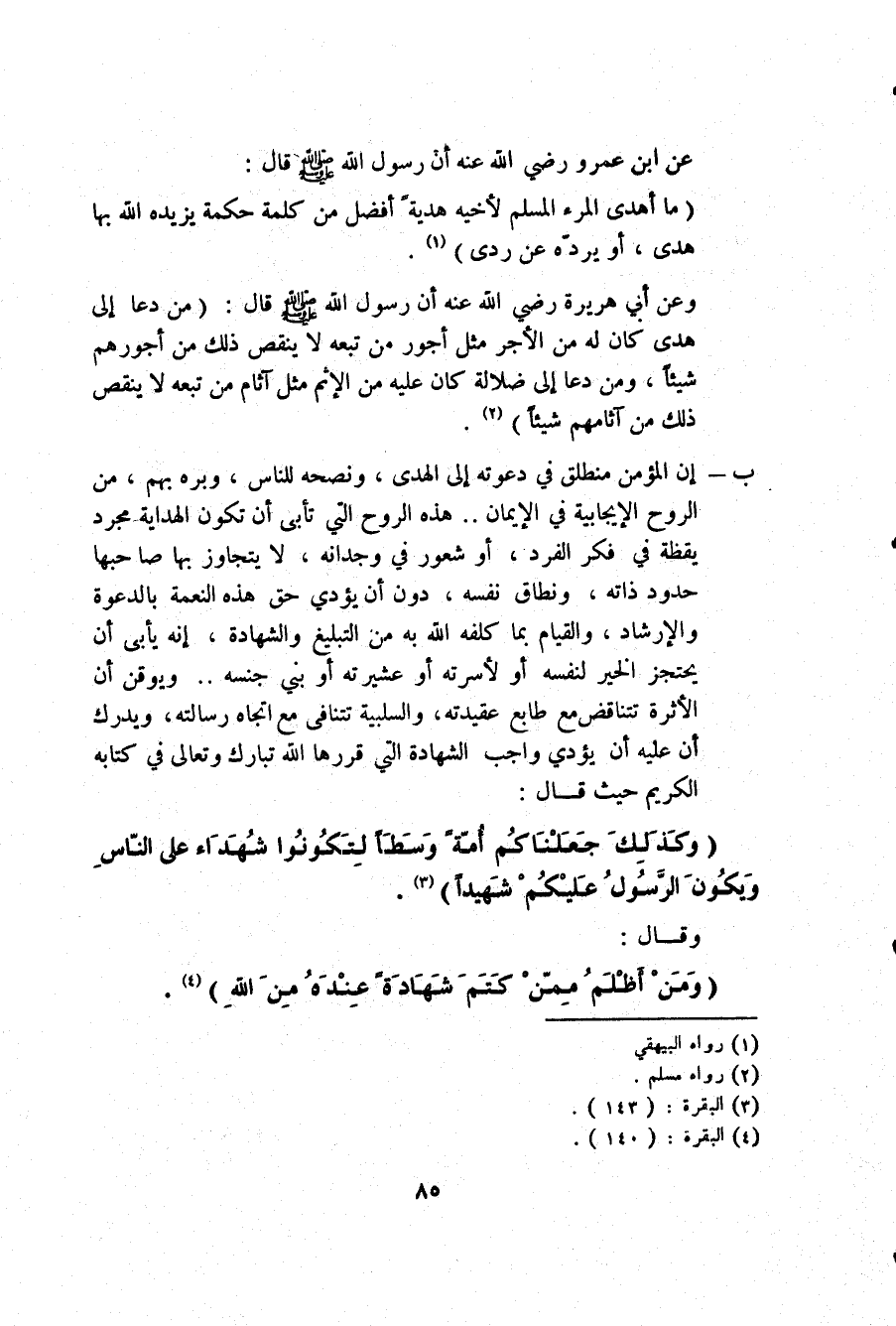 ب- إن المؤمن منطلق في دعوته إلى الهدى، ونصحه للناس، وبره بهم، من الروح الإيجابية في الإيمان.. هذه الروح التي تأبى أن تكون الهداية مجرد يقظة في فكر الفرد، أو شعور في وجدانه، لا يتجاوز بها صاحبها حدود ذاته، ونطاق نفسه دون أن يؤدي حق هذه النعمة بالدعوة والإرشاد، والقيام بما كلفه الله به من التبليغ الشهادة. إنه يأبى أن يحتجز الخير لنفسه أو لأسرته أو عشيرته أو بني جنسه.. ويوقن أن الأثرة تتناقض مع طابع عقيدته، والسلبية تتنافى مع اتجاه رسالته، ويدرك أن عليه أن يؤدي واجب الشهادة التي قررها الله -تبارك وتعالى- في كتابه الكريم حيث قال: