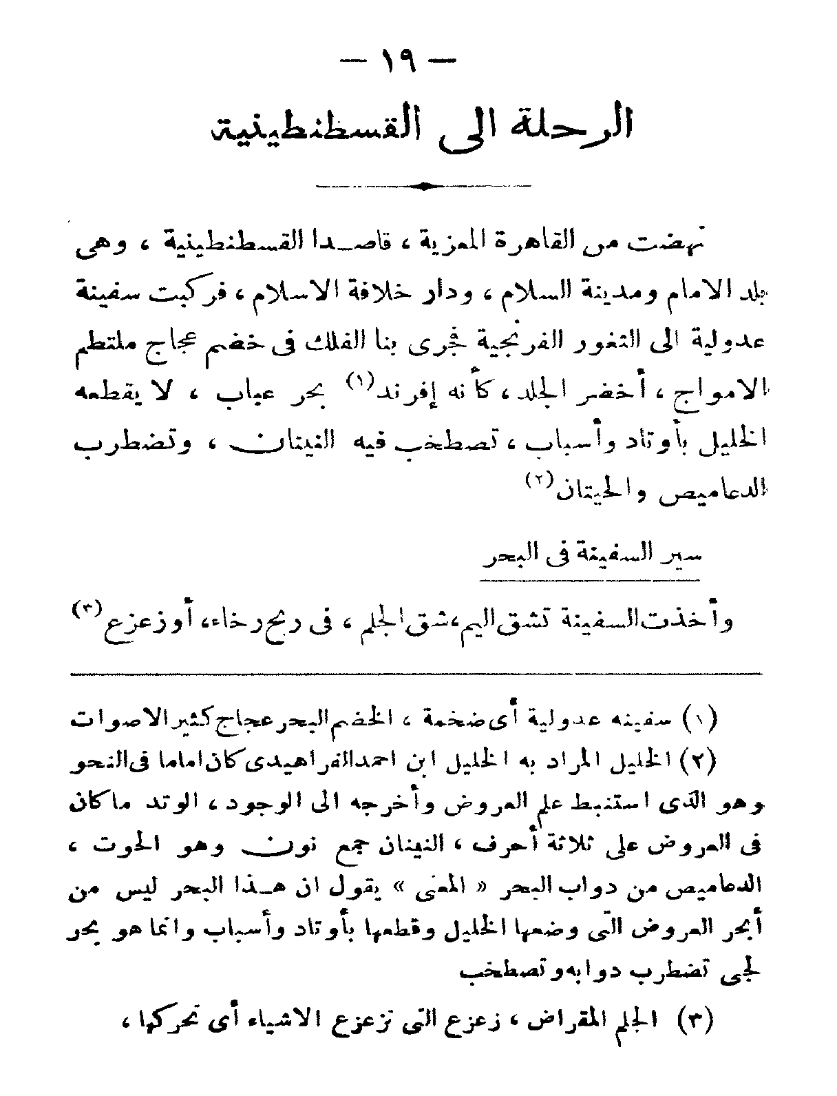 نهضتُ من القاهرة المُعَزِّيّة، قاصداً القسطنطينيّة، وهي بلدُ الإمامِ ومدينةُ السّلامِ، ودارُ خلافةِ الإسلامِ، فركبتُ سفينة عدوليّة إلى الثّغور الفرنجيّة فجرى بنا الفلك في خضمٍّ عجاج ملتطمِ الأمواج، أخضرِ الجلد، كأنّه إفرند بحرٍ عباب، لا يقطِّعْهُ الخليل بأوتادٍ وأسباب، تصطخبُ فيه النينان، وتضطرب الدعاميص والحيتان.
