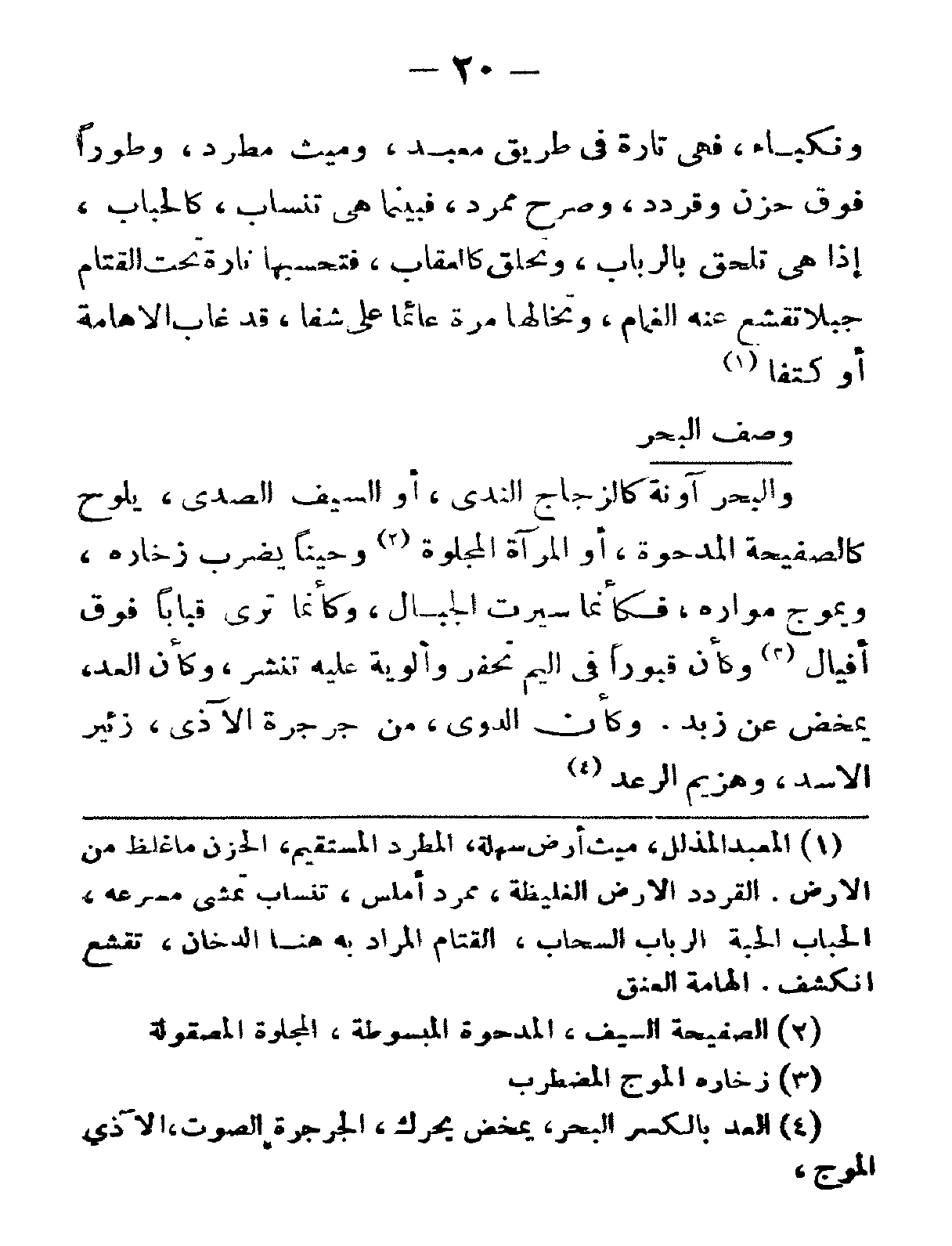 والبحر آونةٌ كالزّجاجِ الندي، أو السّيف الصدي، يلوح كالصّفيحةِ المدحوّة، أو المرآة المجلوّة. وحيناً يضرب زخاره، ويموج مواره، فكأنّما سيّرت الجبال، وكأنّما ترى قباباً فوق أفيال وكأنّ قبوراً في اليمِّ تُحْفَرْ وألويةً عليه تُنْشَرْ، وكأنّ العِدّ يمخض عن زبد. وكأنّ الدوي من جرجرة الآذي، زئير الأسد، وهزيم الرّعد.