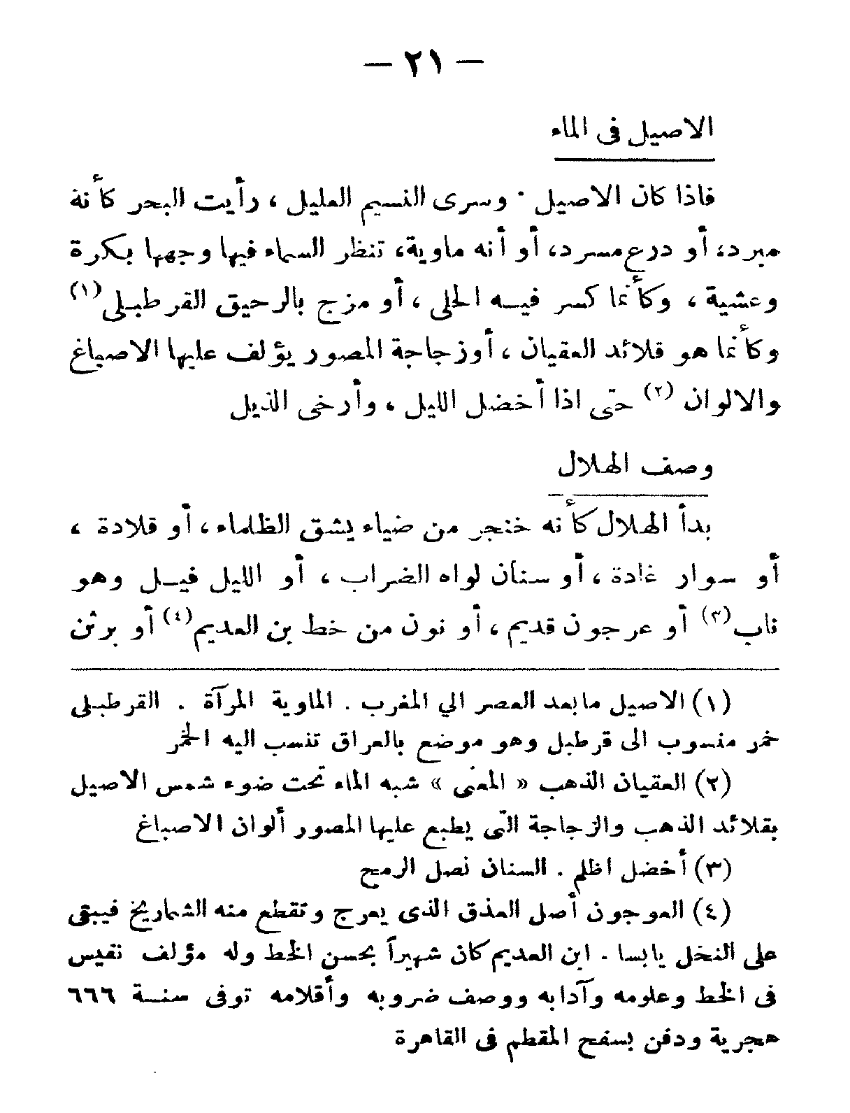 بدأ الهلال كأنّه خنجرٌ من ضياء يشقُّ الظلماء، أو قلادةٌ، أو سوارُ غادةٍ، أو سنانٌ لواه الضِّراب، أو اللّيل فيلٌ وهو ناب أو عرجونٌ قديم، أو نونٌ من خطِّ ابن العديم أو برثنُ