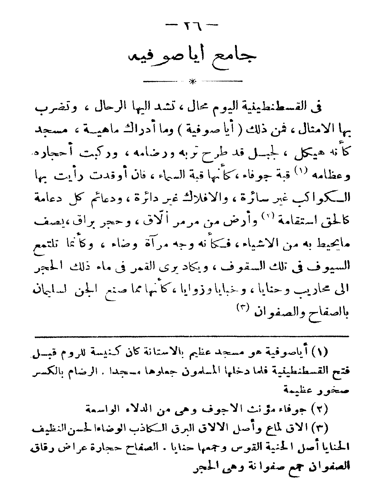 في القسطنطينيّة اليوم محال، تُشَدُّ إليها الرّحال، وتُضْرَبُ بها الأمثال، فمن ذلك (أيا صوفية) وما أدراك ما هيه، مسجدٌ كأنّه هيكل، لجبلٍ قد طرح تربَهُ ورِضامَهُ، ورُكِّبَتْ أحجاره وعظامه قبّة جوفاء، كأنّها قبّة السّماء، فإنْ أوقدت رأيت بها الكواكب غير سائرةٍ، والأفلاك غير دائرةٍ، ودعائم كلّ دعامة كالحقِّ استقامة وأرض من مرمرٍ آلاق، وحجرٍ برّاق، يصف ما يحيط به من الأشياء، فكأنّه في وجه مرآة وضاء، وكأنّما تلتمع السّيوف في تلك السّقوف، ويكاد يرى القمر في ماء ذلك الحجر إلى محاريب وحنايا، وخبايا وزوايا، كأنّها ممّا صنع الجنُّ لسليمان بالصّفاح والصفوان.