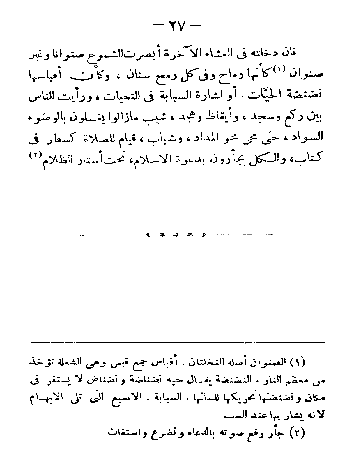 فإنْ دخلته في العشاء الآخرة أبصرت الشّموع صنواناً وغير صنوان كأنّها رماح وفي كلِّ رمحٍ سِنان، وكأنّ أقباسها نضنضةُ الحيّات. أو إشارةُ السّبابةِ في التحيّات، ورأيت النّاس بين ركعٍ وسجدٍ، وأيقاظٍ وهجد، شِيَّبٌ ما زالوا يغسلون بالوضوء السّواد، حتّى مُحِيَ محو المِداد، وشبابٌ قيام للصّلاة كسطرٍ في كتاب، والكلُّ يجأرون بدعوة الإسلام، تحت أستار الظلام.