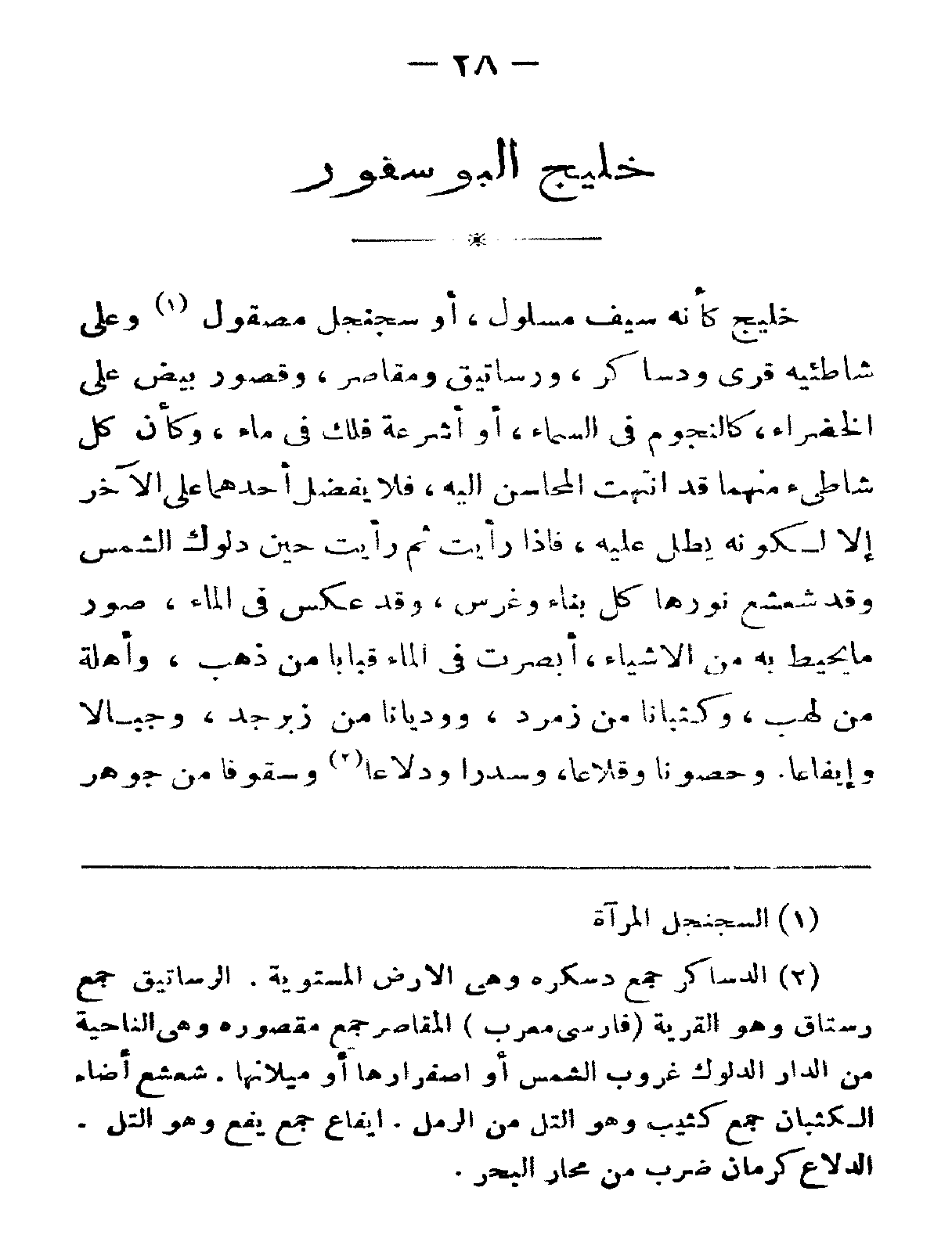 خليجٌ كأنّه سيفٌ مسلول، أو سجنجلٌ مصقولٌ وعلى شاطئيه قرى ودساكر، ورساتيقٌ ومقاصر، وقصورٌ بيضٌ على الخضراء، كالنّجومِ في السّماء، أو أشرعةُ فلكٍ في ماء، وكأنّ كلِّ شاطئ منهما قد انتهت المحاسن إليه، فلا يفضّل أحدهما على الآخر إلّا لكونهِ يطلُّ عليه، فإذا رأيت ثم رأيت حين دلوك الشّمس وقد شعشع نورها كلّ بناءٍ وغرس، وقد عكس في الماء، صورَ ما يحيطُ به من الأشياء، أبصرت في الماء قباباً من ذهب، وأهلةً من لهب، وكثباناً من زمرّد، وودياناً من زبرجد، وجبالاً وأيفاعاً. وحصوناً وقلاعاً، وسدراً ودلاعاً وسقوفاً من جوهر