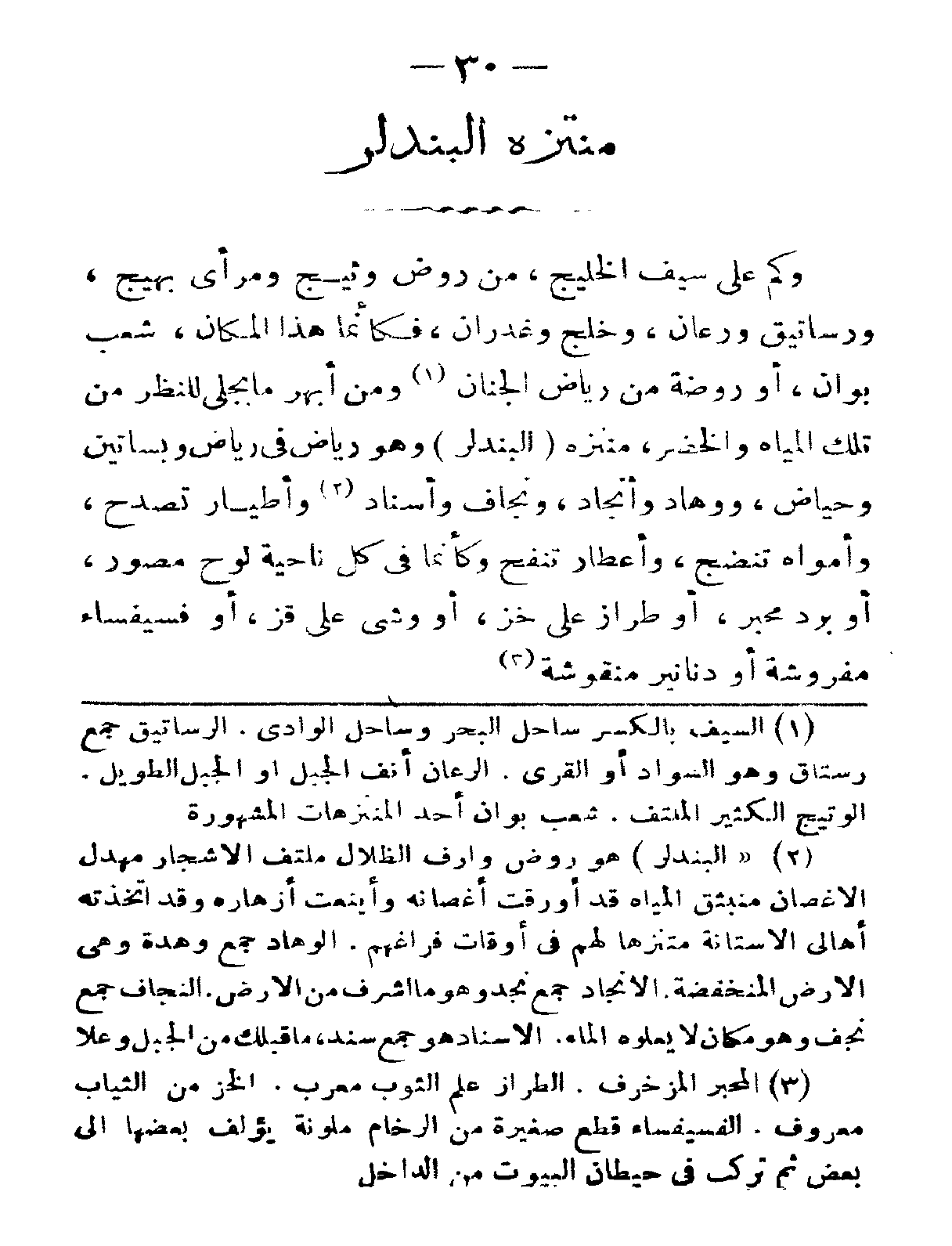 وكم على سيفِ الخليج، من روض وثيج ومرأى بهيج، ورساتيق ورعان، وخلج وغدران، فكأنّما هذا المكان، شِعْبُ بوّان، أو روضة من رياض الجنان ومن أبهر ما يجلي للنّظر من تلك المياه والخضر، منتزه (البندلر) وهو رياض في رياض وبساتين وحياض، ووهاد وأنجاد، ونجاف وأسناد وأطيار تصدح، وأمواه تنضح، وأعطار تنفح وكأنّما في كل ناحية لوح مصوّر، أو برد محبّر، أو طراز على خز، أو وشي على قز، أو فسيفساء مفروشة أو دنانير منقوشة.