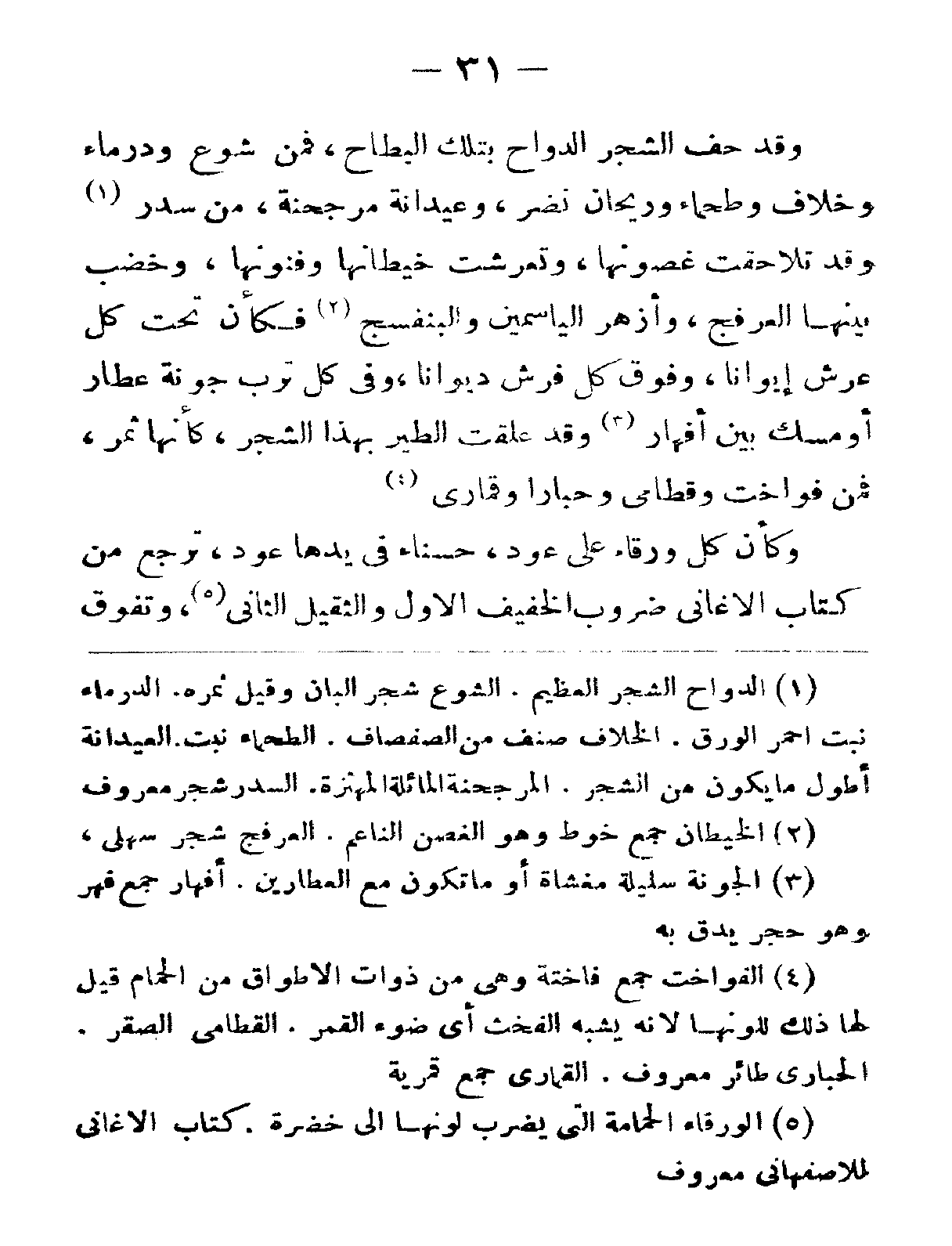وقد حفّ الشّجر الدوّاح بتلك البطاح، فمن شوعٍ ودرماء وخلافٍ وطحماء وريحانٍ نضر، وعيدانةٍ مرجحنة، من سدر وقد تلاحقت غصونها، وتعرّشت خيطانها وفنونها، وخضب بينها العرفج، وأزهر الياسمين والبنفسج فكأن تحت كلّ عرشٍ إيواناً، وفوق كلّ فرشٍ ديواناً، وفي كلّ تربٍ جونة عطار أو مسكٍ بين أفهار وقد علّقت الطّير بهذا الشّجر، كأنّها ثمر، فمن فواخت وقطامي وحباراً وقماري.