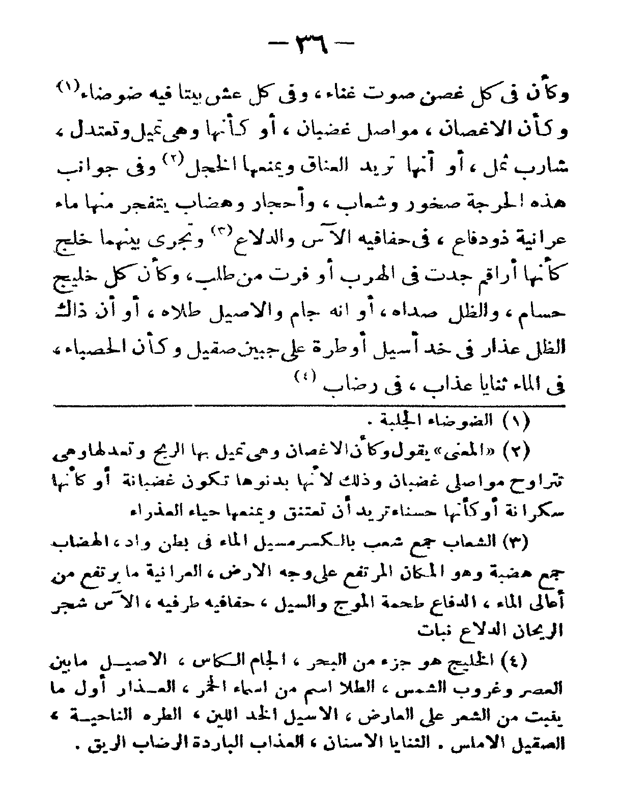 وكأنّ في كلّ غصنٍ صوتُ غنّاء، وفي كلّ عشٍّ بيتاً فيه ضوضاء وكأنّ الأغصان، مواصل غضبان، أو كأنّها وهي تميل وتعتدل، شاربٌ ثمل، أو أنّها تريد العناق ويمنعها الخجل وفي جوانب هذه الحرجة صخورٌ وشعاب، وأحجارٌ وهضاب يتفجّر منها ماءٌ عرانية ذو دفاع، في حفافية الآس والدلاع، وتجري بينهما خلجٌ كأنّها أراقمٌ جدّت في الهرب أو فرّت من طلب، وكأنّ كلّ خليجٍ حسام، والظّلّ صداه، أو أنّه جامٌ والأصيل طلاه، أو أنّ ذلك الظّلّ عذارٍ في خدّ أسيل أو طرّةٌ على جبين صقيل وكأنّ الحصباء، في الماء ثنايا عذاب، وفي رضاب.