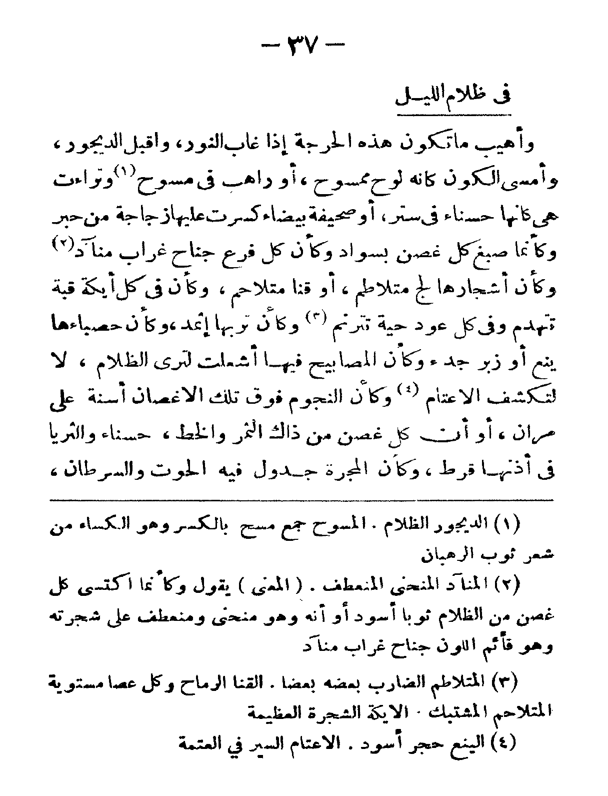 منآد وكأنّ أشجارها لجٌّ متلاطم، وكأنّ في كلّ أيكةٍ قبةٌ تتهدّم وفي كلّ عودٍ حيّةٌ تترنّم وكأنّ تربها إثمد، وكأنّ حصباءها ينعٌ أو زبرجد وكأنّ المصابيح فيها اشتعلت لترى الظّلام، لا لتكشف الإعتام وكأنّ النّجوم فوق تلك الأغصان أسنّةٌ على مران، أو أنّ كلّ غصنٍ من ذاك السّمر والخطّ، حسناءُ والثّريّا في أذنها قرطٌ، وكأنّ المجرّة جدولٌ فيه الحوت والسّرطان،