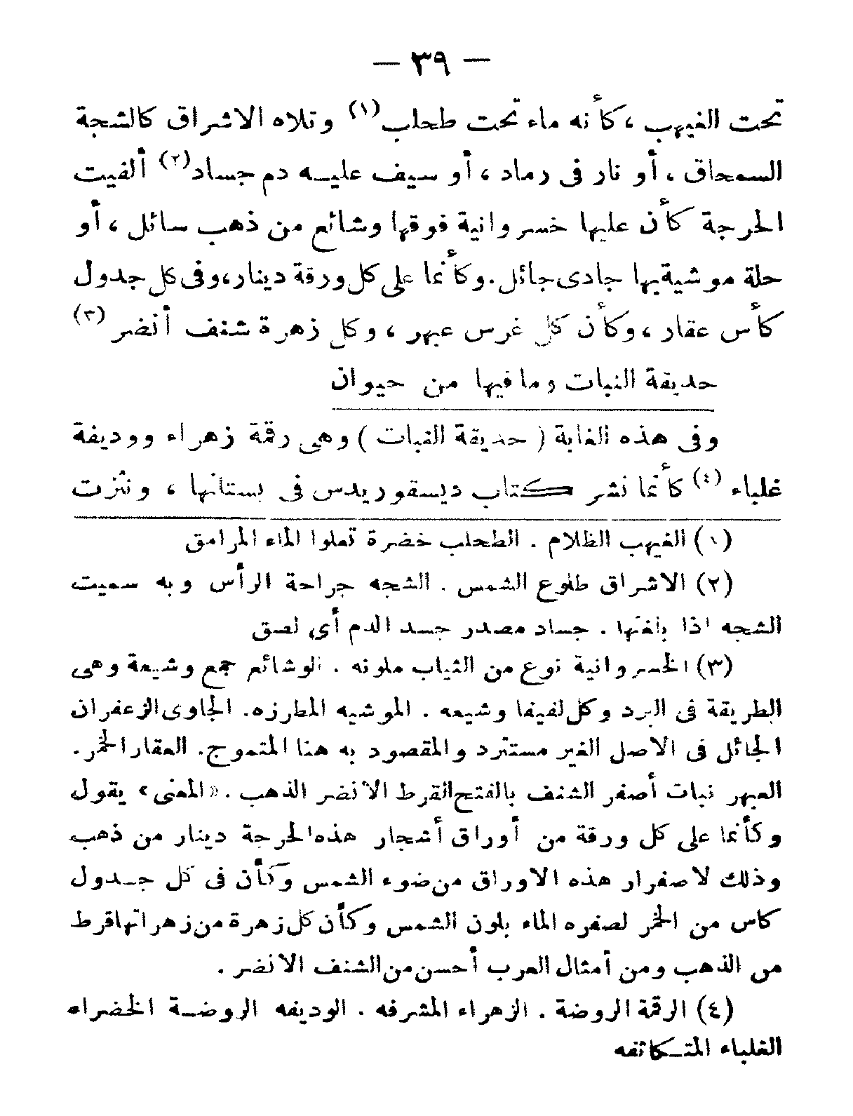 وفي هذه الغابة (حديقة النبات) وهي رقمةٌ زهراء ووديفةٌ غلباء كأنّما نشر كتاب ديسقوريدس في بستانها، ونثرت