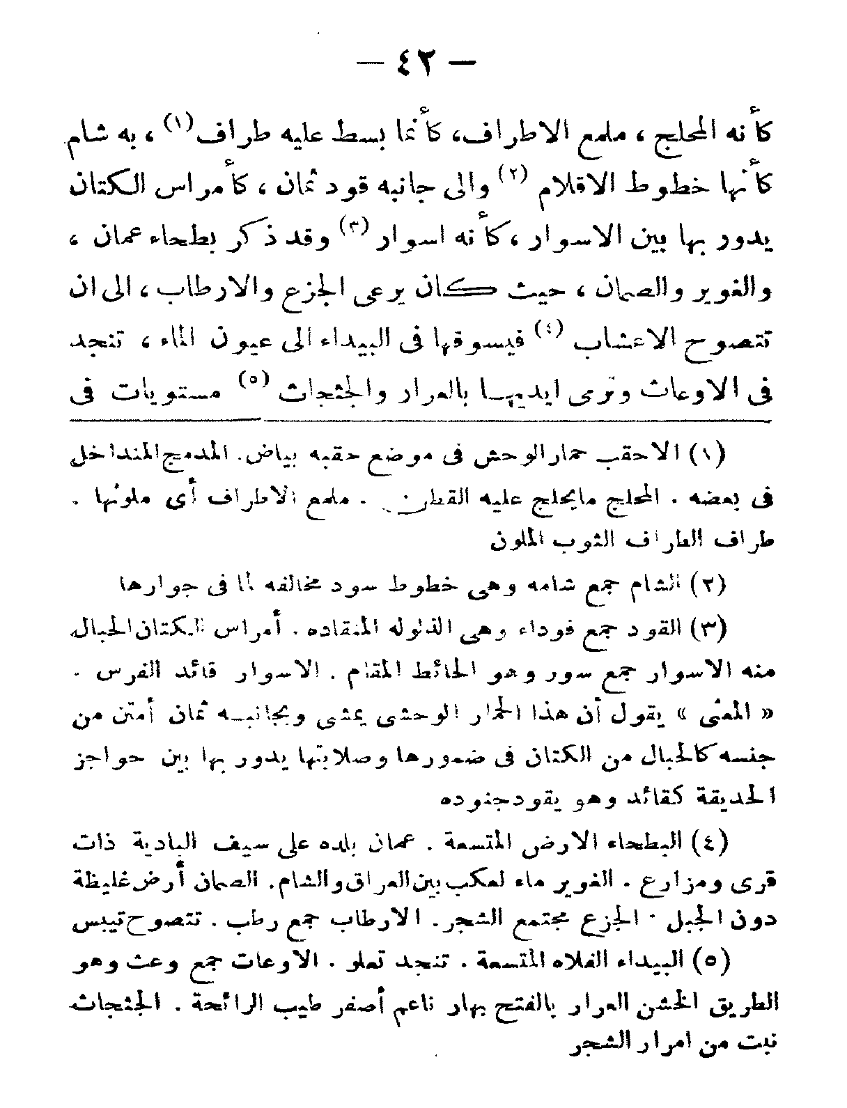 كأنّه المحلج، ملمّع الأطراف، كأنّما بُسِطَ عليه طراف، به شام كأنّها خطوط الأقلام وإلى جانبه قود ثمان، كأمراسِ الكتّان يدور بها بين الأسوار، كأنّه أسوار وقد ذكر بطحاء عمان، والغوير والصّمّان، حيث كان يرعى الجزع والأرطاب، إلى أن تتصوّح الأعشاب فيسوقها في البيداء إلى عيون الماء، تنجد في الأوعاث وترمي أيديها بالعرار والجثجاث مستويات في