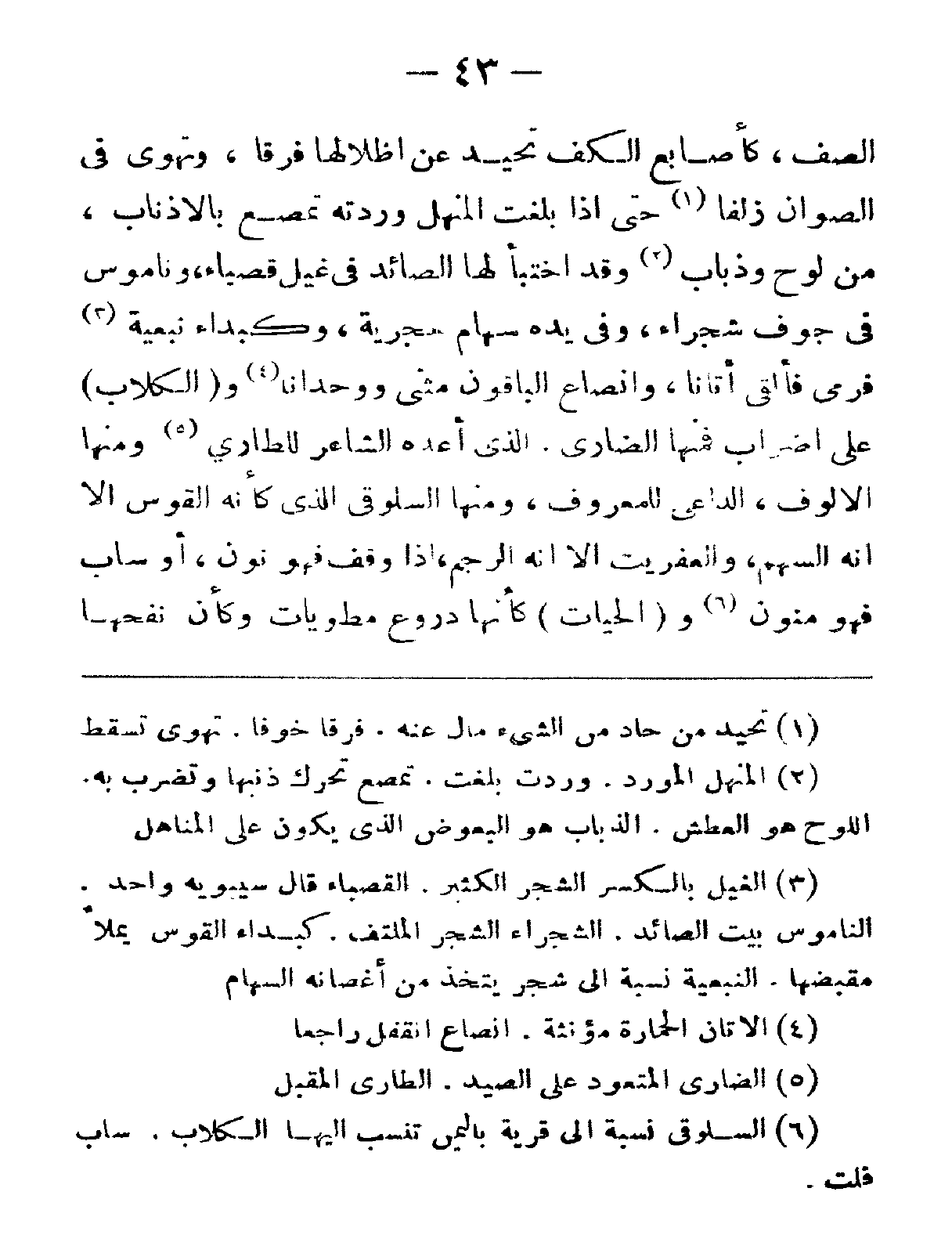 الصّفّ، كأصابع الكفّ تحيد عن أظلالها فرقاً، وتهوي في الصوّان زلفاً حتّى إذا بلغت المنهل وردته تمصع بالأذناب، من لوحٍ وذباب وقد اختبأ لها الصائد في غيل قصباء، وناموس في جوف شجراء، وفي يده سهام حجريّة، وكبداء نبعيّة فرمى فألقى أتاناً، وانصاع الباقون مثنى ووحداناً و (الكلاب) على أضراب فمنها الضاري. الّذي أعدّه الشّاعر للطاري ومنها الألوف، الدّاعي للمعروف، ومنها السلوقيّ الّذي كأنّه القوس إلّا أنّه السّهم، والعفريت إلّا أنّه الرّجم، إذا وقف فهو نون، أو ساب فهو منون و (الحيّات) كأنّها دروع مطويّات وكأنّ نفحها