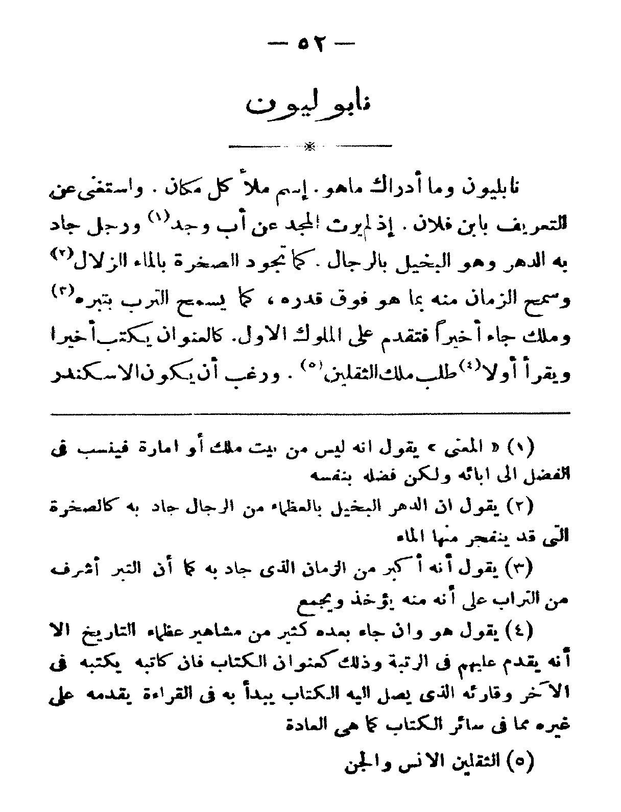 نابليون وما أدراك ما هو. اسمٌ ملأ كلّ مكان. واستغنى عن التعريف بابن فلان. إذ لم يرث المجد عن أب وجدّ، ورجلٌ جاد به الدّهر وهو البخيل بالرّجال. كما تجود الصخرة بالماء الزلال، وسمح الزمان منه بما هو فوق قدره، كما يسمح الترب بتبره، ومَلِكٌ جاء أخيراً فتقدّم على الملوك الأُوَلْ. كالعنوان يُكْتَبُ أخيراً ويُقْرَأُ أولاً، طَلَبَ مُلْكُ الثّقَلَيْن. ورغب أن يكون الإسكندر
