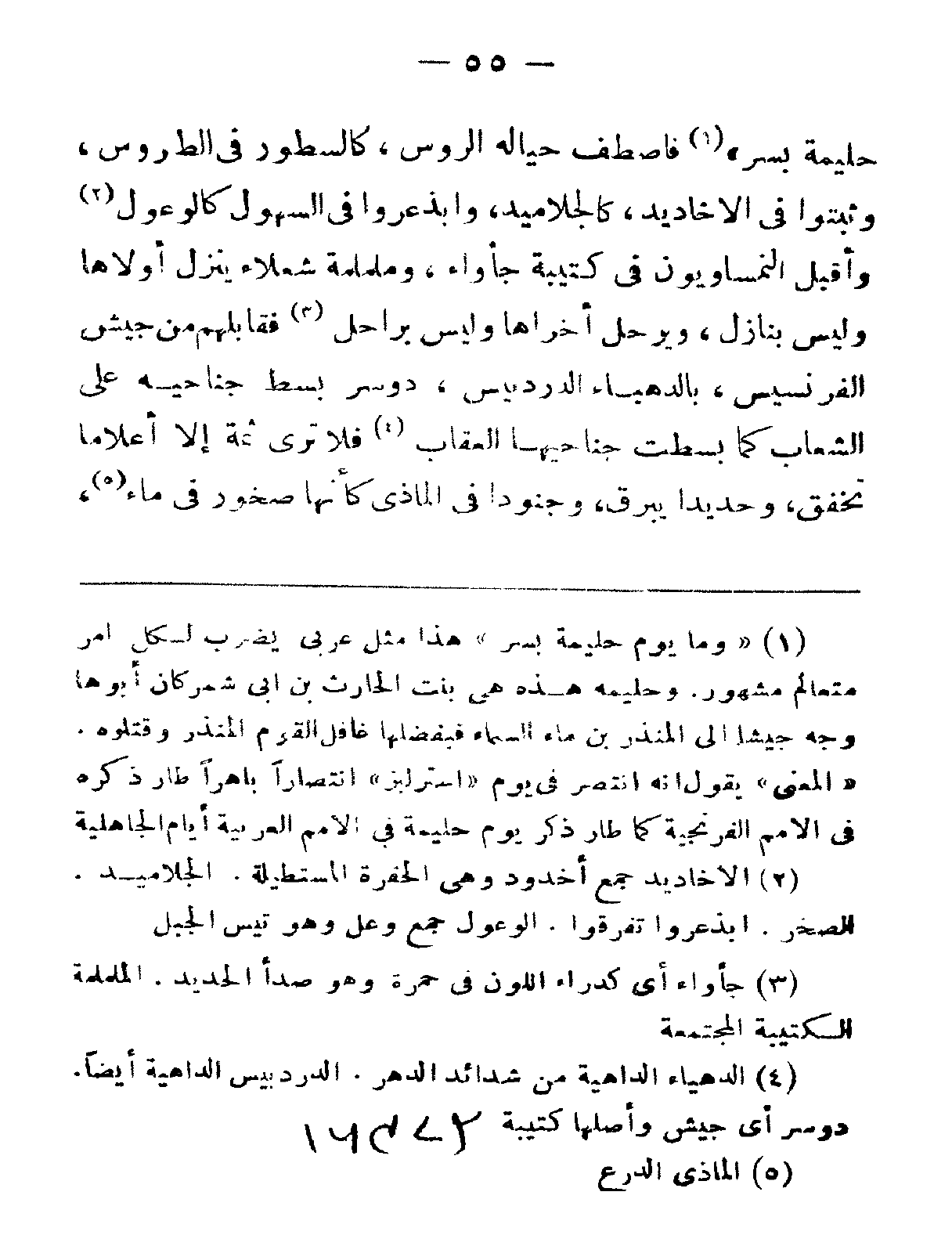 حليمة بسِرّ فاصطفّ حياله الرّوس، كالسّطور في الطروس، وثبتوا في الأخاديد، كالجلاميد، وابذعروا في السّهول كالوعول، وأقبل النمساويّون في كتيبةٍ جأواء، وملمامةٍ شعلاء ينزل أُولاها وليس بنازل، ويرحل أُخراها وليس براحل، فقابلهم من جيش الفرنسيس، بالدهياء الدردبيس، دوسر بسط جناحيه على الشّعاب كما بسطت جناحها العقاب، فلا ترى ثمّة إلّا أعلاماً تخفق، وحديداً يبرق، وجنوداً في المآذي كأنّها صخور في ماء،