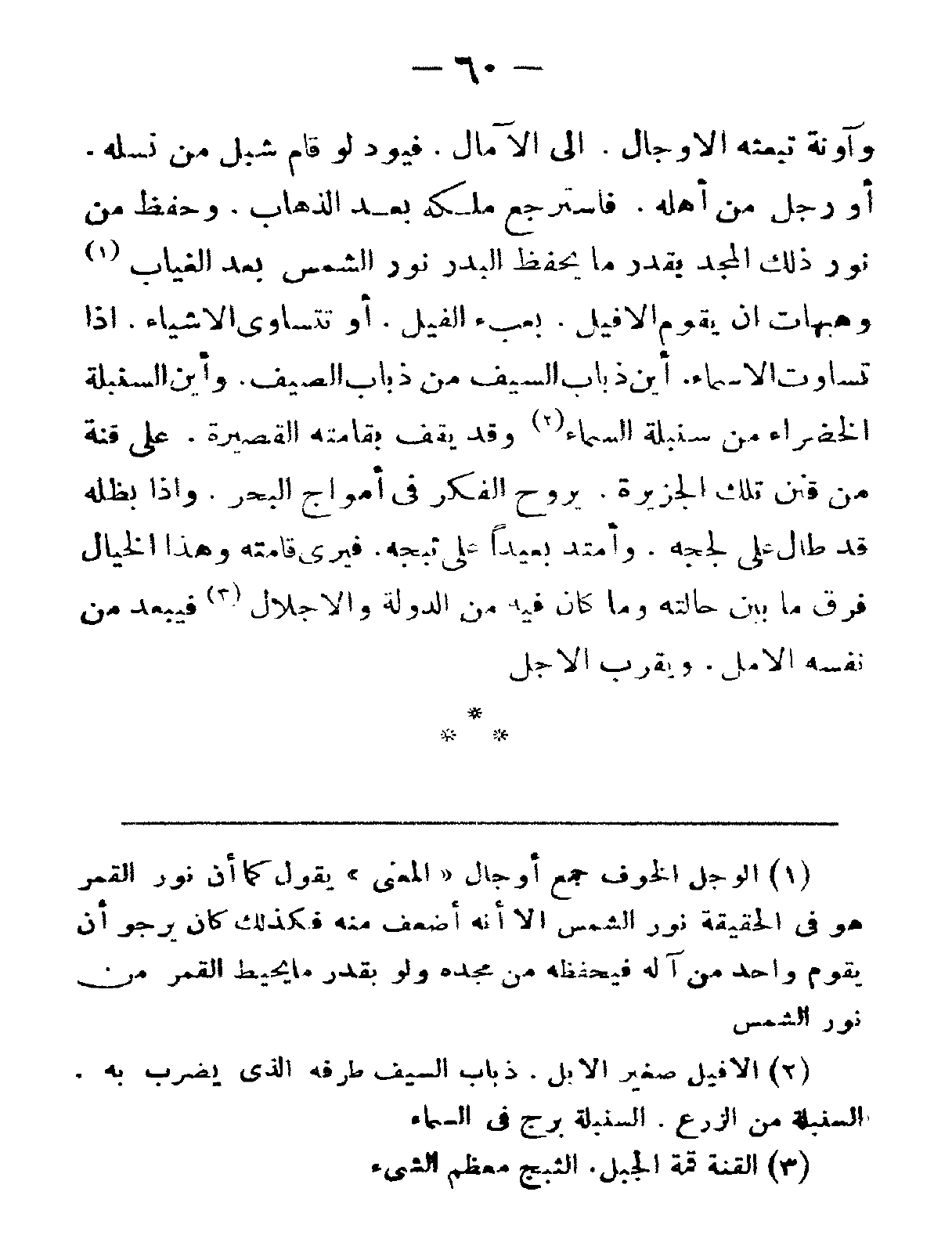 وآونة تبعثه الأوجال إلى الآمال. فيودّ لو قام شبلٌ من نسله أو رجلٌ من أهله. فاسترجع ملكه بعد الذّهاب. وحفظ من نور ذلك المجد بقدر ما يحفظ البدر نور الشّمس بعد الغياب، وهيهات أن يقوم الأفيل. بعبء الفيل. أو تتساوى الأشياء. إذا تساوت الأسماء. أين ذباب السّيف من ذباب الصّيف. وأين السنبلة الخضراء من سنبلة السّماء، وقد يقف بقامته القصيرة. على قنة من قنن تلك الجزيرة. بروح الفكر في أمواج البحر. وإذا بظلّه قد طال على لججه. وامتدّ بعيداً على ثبجه. فيرى قامته وهذا الخيال فرّق ما بين حالته وما كان فيه من الدولة والإجلال، فيبعد من نفسه الأمل. ويقرّب الأجل.