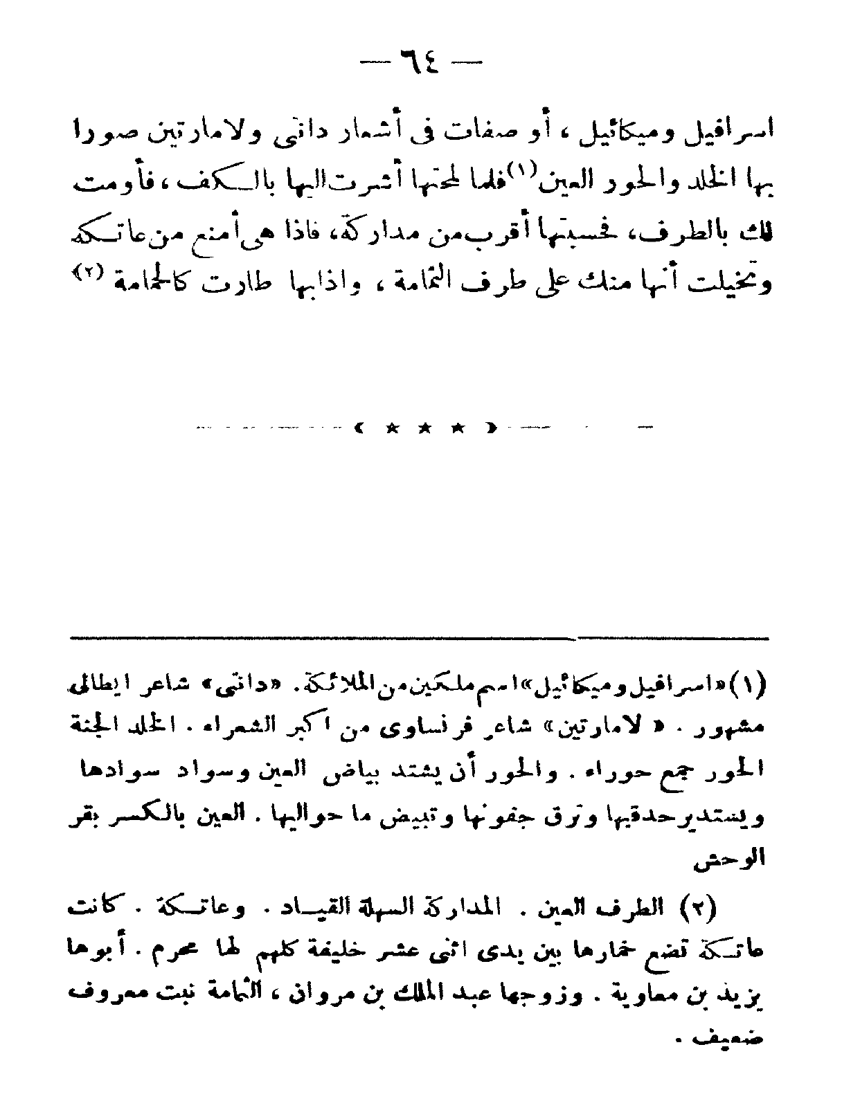 إسرافيل وميكائيل، أو صفاتٍ في أشعار دانتي ولامارتين صوراً بها الخلد والحور العين فلمّا لمحتها أشرتُ إليها بالكفِّ، فأومتْ لك بالطّرف، فحسبتها أقرب من مداركة، فإذا هي أمنع من عاتكة وتخيّلت أنّها منك على طرف الثمامة، وإذا بها طارت كالحمامة.