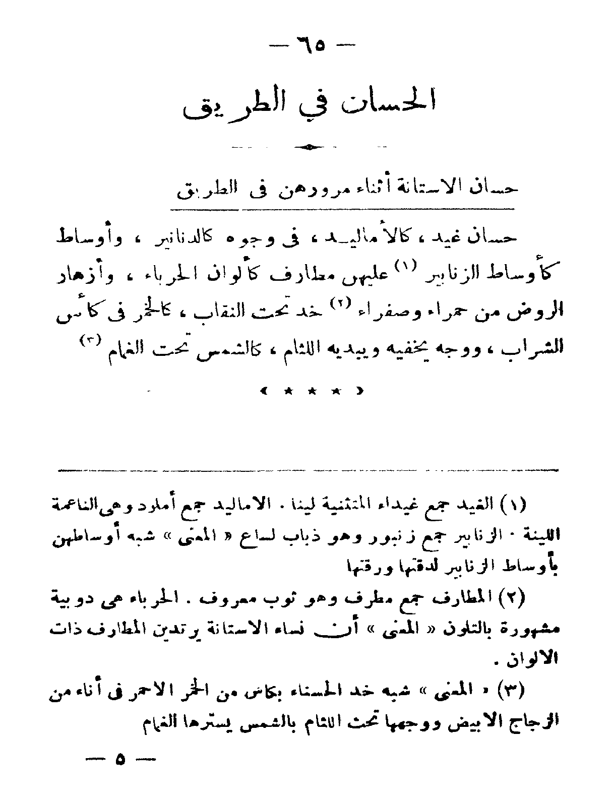حسانٌ غيدٌ كالأماليد، في وجوهٍ كالدّنانير، وأوساطٍ كأوساطِ الزّنابير، عليهن مطارف كألوان الحرباء، وأزهار الرّوض من حمراء وصفراء. خدٌّ تحت النّقاب، كالخمرِ في كأس الشّراب، ووجهٍ يخفيه ويبديه اللّثام، كالشّمس تحت الغمام.