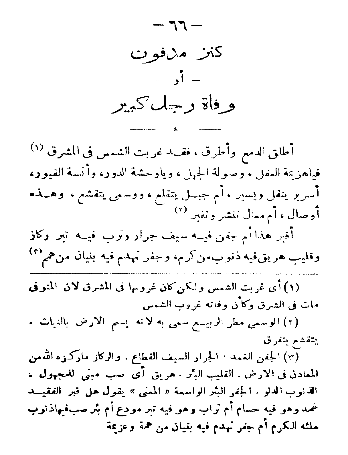 أطلق الدمع وأطرق، فقد غربت الشمس في المشرق. فيا هزيمة العقل، وصولة الجهل، ويا وحشة الدور، وأنسة القبور، أسريرٌ ينقل ويسير، أم جبلٌ يتقلّع، ووسمي يتقشّع، وهذه أوصال، أم معال تنشر وتقبر.