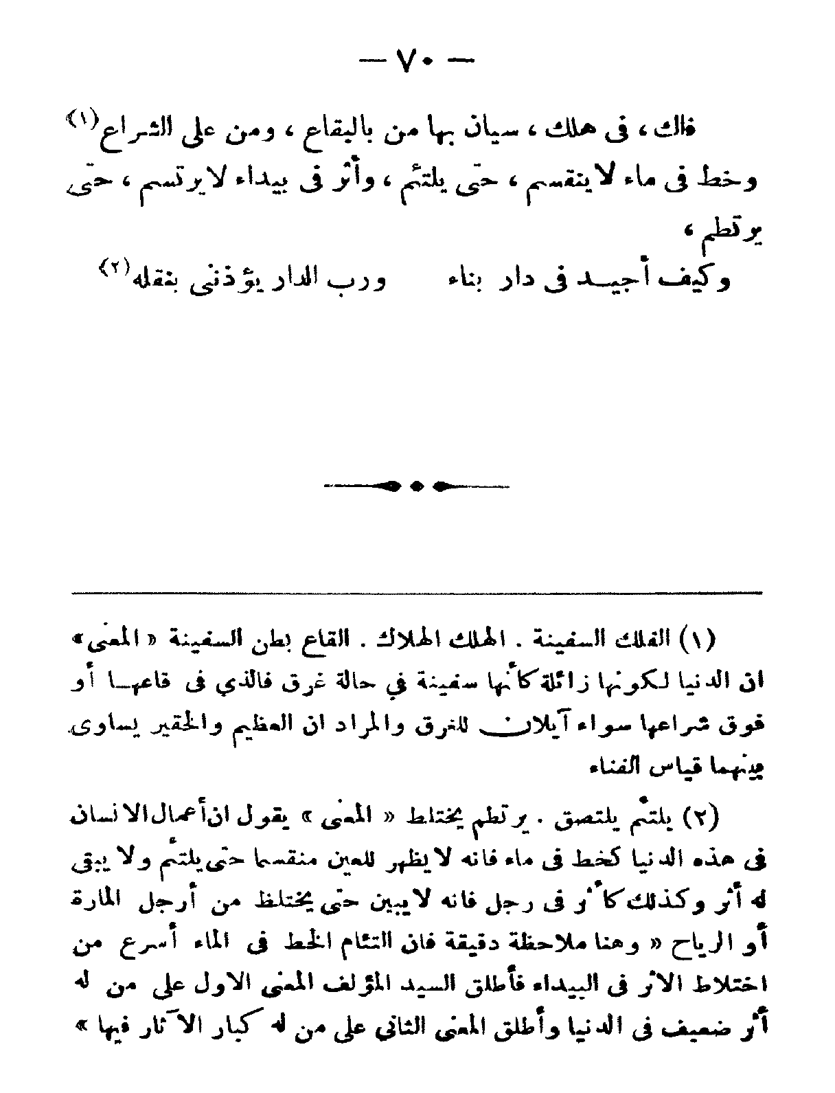 فلكٌ في هلك، سيّان بها من بالبقاع، ومن على الشّراع. وخطٌ في ماءٍ لا ينقسم، حتّى يلتئم، وأثرٌ في بيداء لا يرتسم، حتّى يرتطم.