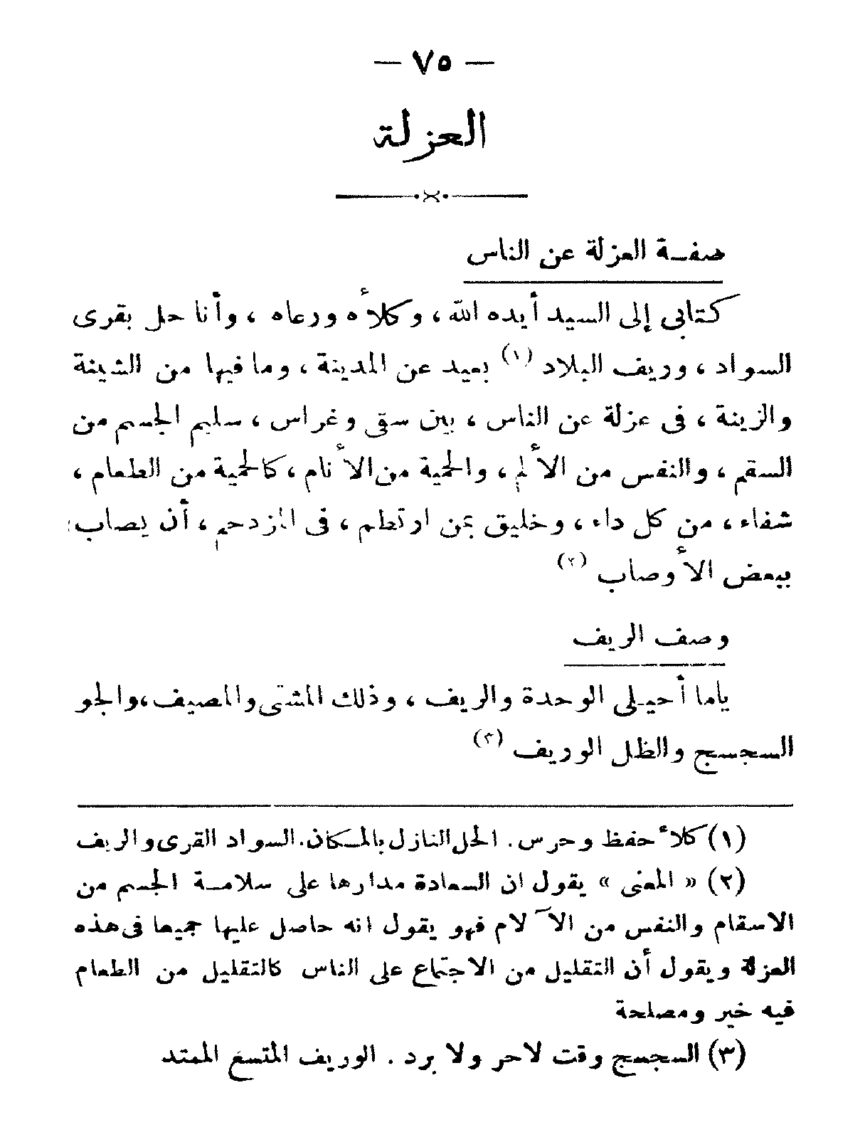 كتابي إلى السّيد أيّده الله، وكلأه ورعاه، وأنا حِلٌّ بقرى السّواد، وريف البلاد، بعيدٌ عن المدينة، وما فيها من الشّينة والزّينة، في عزلةٍ عن النّاس، بين سقيٍ وغراس، سليمُ الجسم من السّقم، والنفسِ من الألم، والحميةِ من الأنام، كالحميةِ من الطعام، شفاء من كلّ داء، وخليق بمن ارتطم، في المزدحم، أن يصاب ببعض الأوصاب.