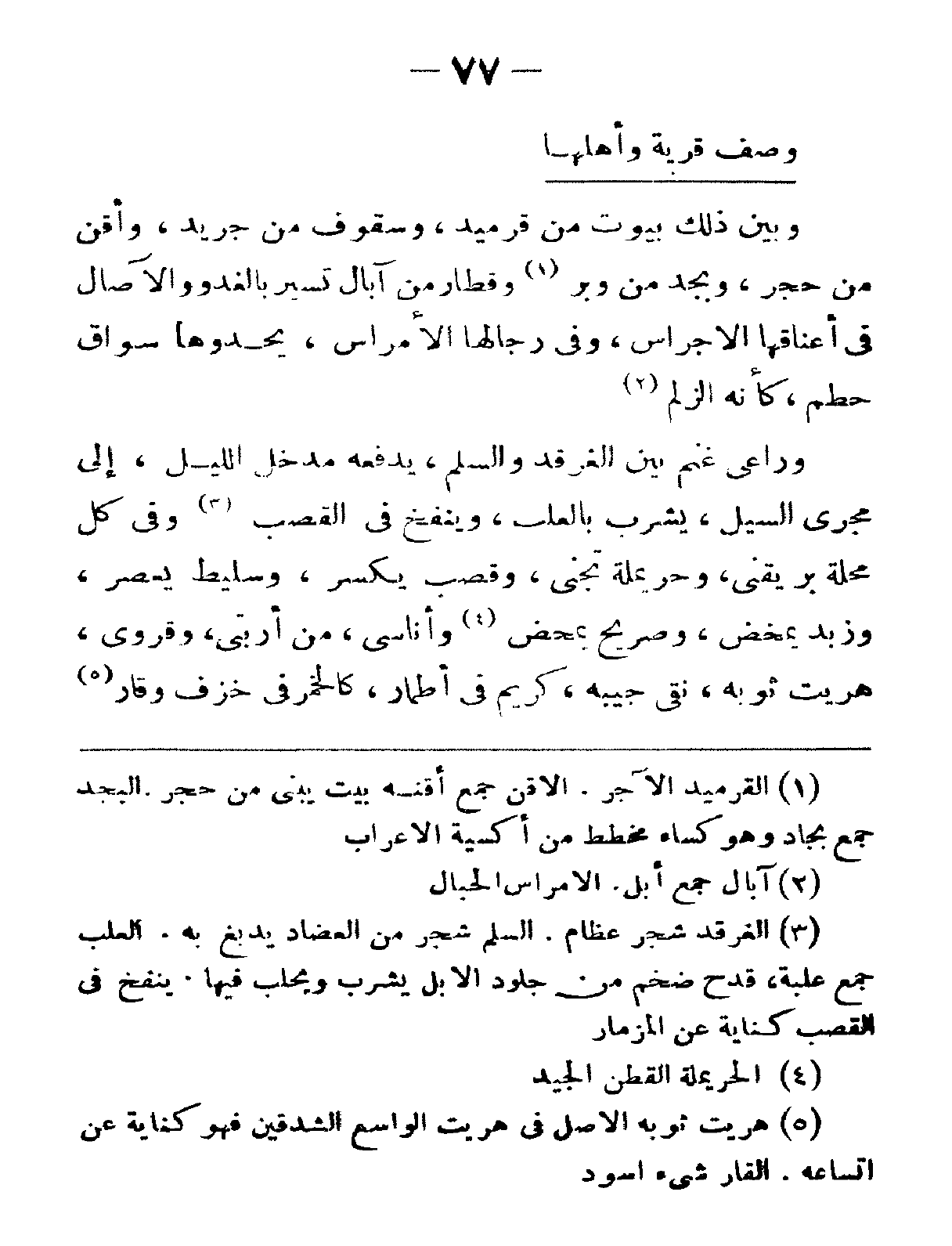 وبين ذلك بيوتٌ من قرميد، وسقوفٌ من جريد، وأقنٌ من حجر، وبجدٌ من وبر، وقطارٌ من آبال تسير بالغدو والآصال في أعناقها الأجراس، وفي رجالها الأمراس، يحدوها سواق حطم، كأنّه الزّلم.