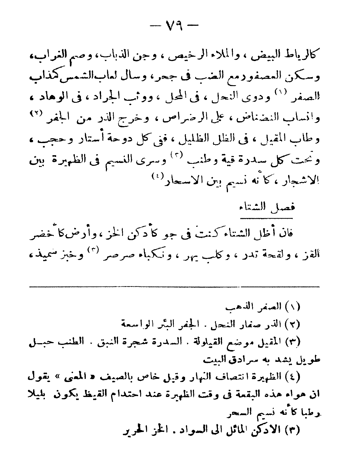 كالرّياط البيض، والملاء الرّخيص، وجنّ الذباب، وصمّ الغراب، وسكن العصفور مع الضبّ في حجر، وسال لعاب الشّمس كمذاب الصّفر ودوّى النحل في المحل، ووثب الجراد، في الوهاد، وانساب النضناض، على الرضراض، وخرج الذرّ من الجفر وطاب المقيل، في الظّل الظّليل، ففي كلّ دوحةٍ أستارٌ وحجب، وتحت كلّ سدرةٍ قيّةٌ وطنب وسرى النّسيم في الظّهيرة بين الأشجار، كأنّه نسيم بين الأسحار.