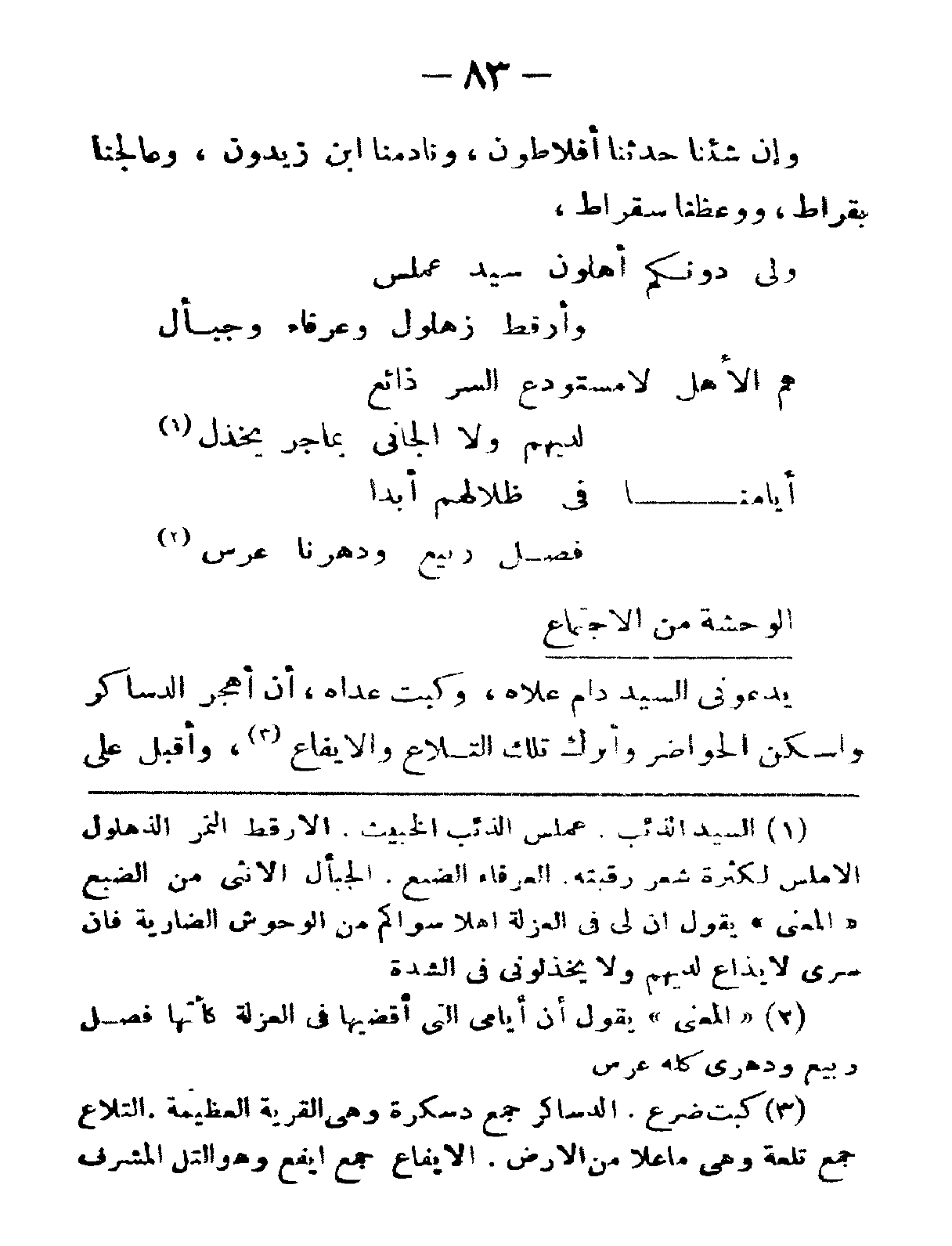 وإن شئنا حدثنا أفلاطون، ونادمنا ابن زيدون، وعالجنا بقراط، ووعظنا سقراط: