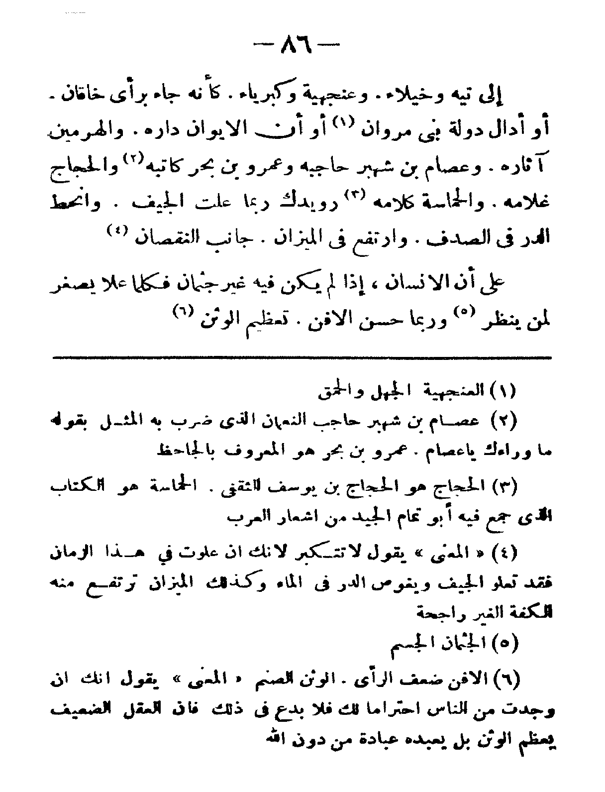 إلى تيهٍ وخيلاء. وعنجهيةٍ وكبرياء. كأنّه جاء برأي خاقان. أو أدلّ دولة بني مروان، أو أنّ الإيوان داره. والهرمين آثاره. وعصام بن شهبر حاجبه وعمرو بن بحر كاتبه والحجّاج غلامه. والحماسة كلامه، رويدك ربّما علت الجيف.