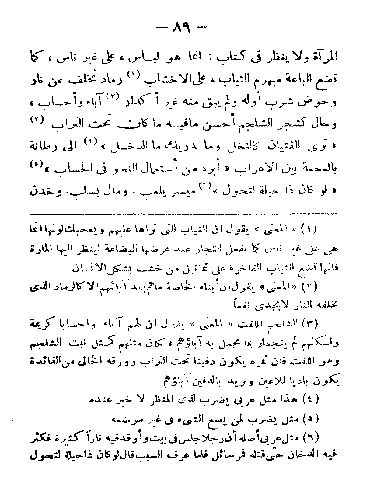 ي المرآة ولا ينظر في كتاب: إنّما هو لباس، على غيرِ ناس، كما تضع الباعةُ مبهرم الثّياب، على الأخشاب، رمادٌ تخلّف عن نار وحوض شُرِبَ أوّله ولم يبق منه غير أكدار، آباءٌ وأحساب، وحالٌ كشجر الشّلجم أحسن ما فيه ما كان تحت التراب ترى الفتيان كالنّخل وما يدريك ما الدّخل إلى رطانةٍ بالعجمة بين الأعراب أبرد من استعمال النّحو في الحساب لو كان ذا حيلة لتحوّل ميسرٌ يلعب. ومالٌ يُسْلَب. وخدنٌ