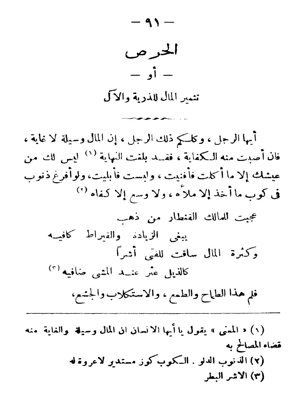 أيّها الرّجل، وكلكم ذلك الرّجل، إنّ المال وسيلة لا غاية، فإن أصبت منه الكفاية، فقد بلغت النّهاية، ليس لك من عيشك إلا ما أكلت فأفنيت، ولبست فأبليت، ولو أفرغ ذَنُوبٌ في كوب ما أخذ إلّا ملأه، ولا وسع إلّا كفاه.