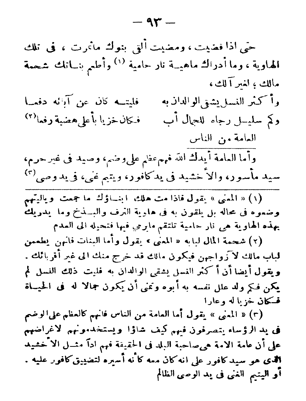 حتّى إذا قضيت، ومضيت ألقى بنوك ما ثمرت، في تلك الهاوية، وما أدرك ماهية نارُ حامية، وأطعم بناتك شحمة مالك لغير آلك.
