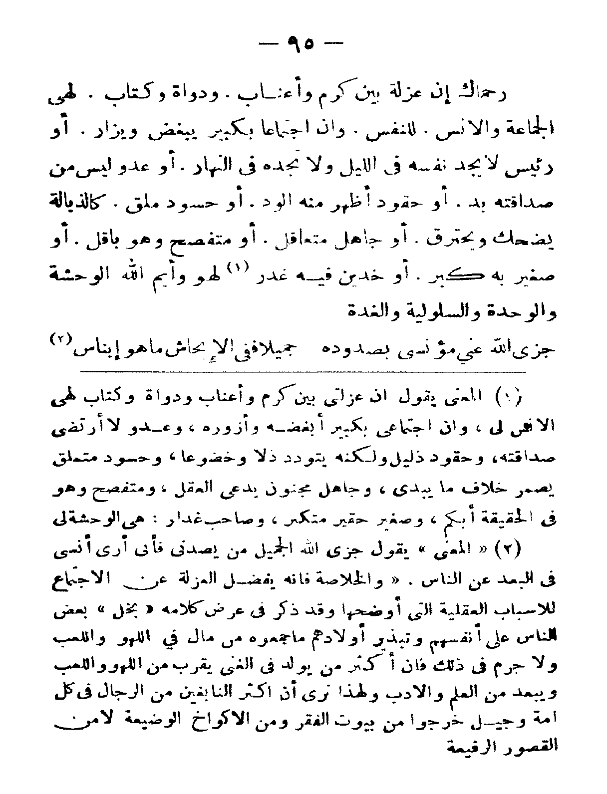 رحماك إن عزلة بين كرمٍ وأعناب. ودواةٍ وكتاب. لهي الجماعة والأنس للنفس. وإن اجتماعاً بكبيرٍ يُبغض ويُزار. أو رئيسٍ لا يجد نفسه في اللّيل ولا تجده في النهار. أو عدوٍ ليس من صداقته بدٌّ. أو حقودٍ أظهر منه الود. أو حسودٍ ملق. كالذبالة يضحك ويحترق. أو جاهلٍ متعاقل. أو متفصحٍ وهو باقل. أو صغيرٍ به كبر. أو خدين فيه غدر، لهو وأيم الله الوحشة والوحدة والسلولية والغدة.