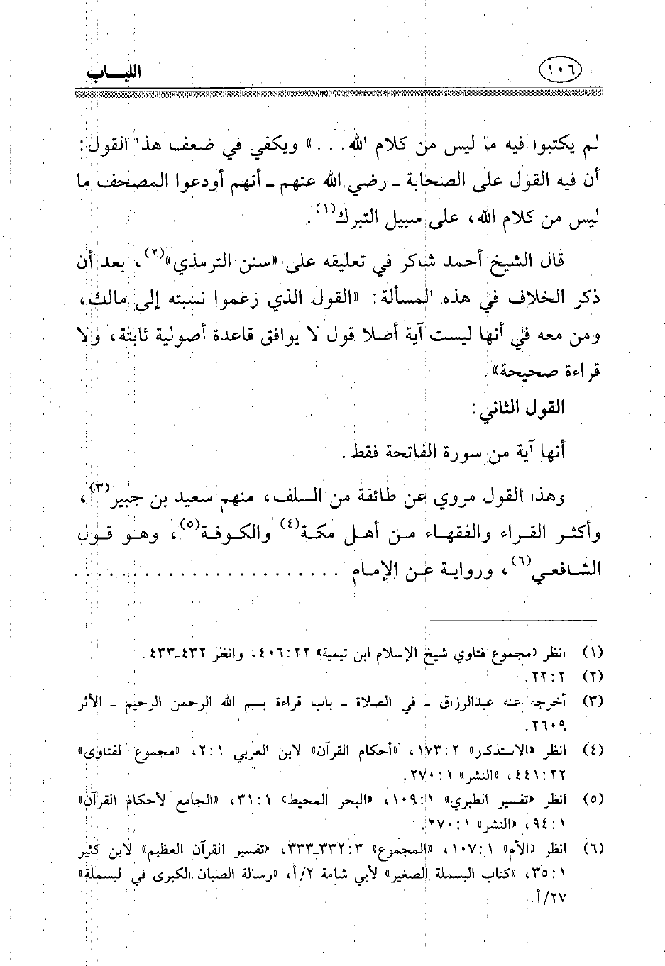 (¬6) انظر «الأم» 1: 107، «المجموع» 3: 332 - 333، «تفسير القرآن العظيم» لابن كثير 1: 35، «كتاب البسملة الصغير» لأبي شامة 2/ أ، «رسالة الصبان الكبرى في البسملة» 27/ أ.