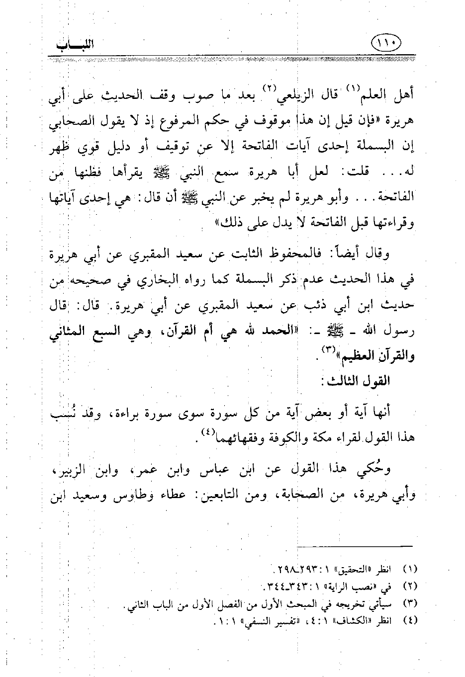 أهل العلم (¬1) قال الزيلعي (¬2) بعد ما صوب وقف الحديث على أبي هريرة «فإن قيل أن هذا موقوف في حكم المرفوع إذ لا يقول الصحابي إن البسملة إحدى آيات الفاتحة إلا عن توقيف أو دليل قوي ظهر له قلت: لعل أبا هريرة سمع النبي - صلى الله عليه وسلم - يقرأها فظنها من الفاتحة , وأبو هريرة لم يخبر عن النبي - صلى الله عليه وسلم - أن قال: هي إحدى آياتها وقراءتها قبل الفاتحة لا يدل على ذلك».