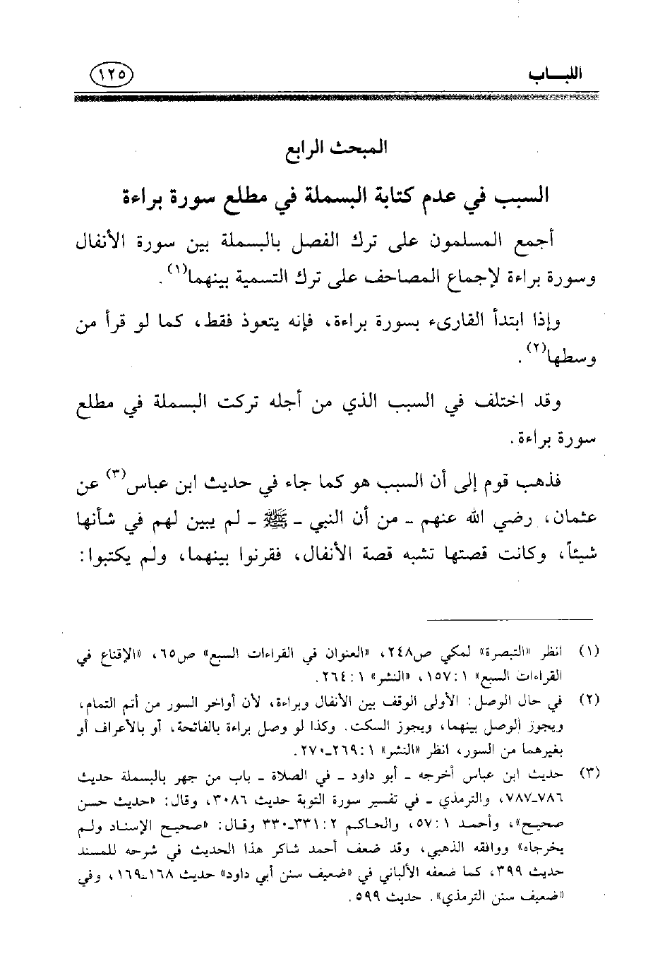 (¬3) حديث ابن عباس أخرجه - أبو داود- في الصلاة- باب من جهر بالبسملة حديث 786 - 787، والترمذي- في تفسير سورة التوبة حديث 3086، وقال: «حديث حسن صحيح»، وأحمد 1: 57، والحاكم 2: 331 - 330، وقال: «صحيح الإسناد ولم يخرجاه» ززافقه الذهبي، وقد ضعف أحمد شاكر هذا الحديث في شرحه للمسند حديث 399، كما ضعفه الألباني في «ضعيف سنن أبي داود» حديث 168 - 169، وفي «ضعيف سنن الترمذي» حديث 599.