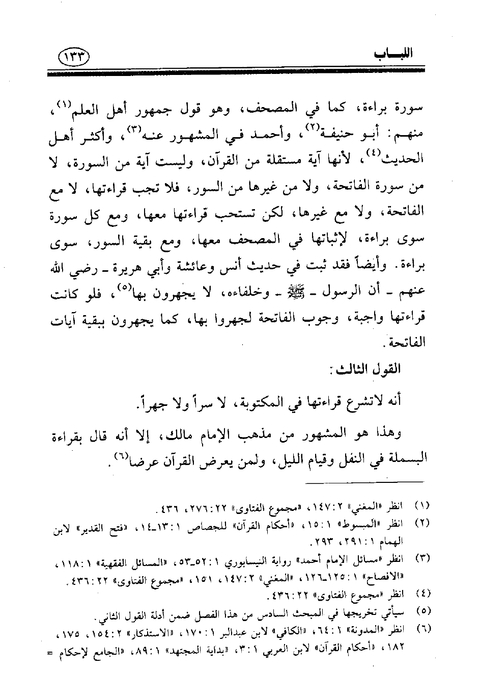 سورة براءة، كما في المصحف، وهو قول جمهور أهل العلم (¬1)، منهم: أبو حنيفة (¬2)، وأحمد في المشهور عنه (¬3)، وأكثر أهل الحديث (¬4)، لأنها آية مستقلة من القرآن، وليست آية من السورة، لا من سورة الفاتحة، ولا من غيرها من السور، فلا تجب قراءتها، لا مع الفاتحة، ولا مع غيرها، لكن تستحب قراءتها معها، ومع كل سورة سوى براءة، لإثباتها في المصحف معها، ومع بقية السور، سوى براءة. وأيضًا فقد ثبت في حديث أنس وعائشة وأبي هريرة - رضي الله عنهم - أن الرسول ... - صلى الله عليه وسلم - وخلفاءه، لا يجهرون بها (¬5)، فلو كانت قراءتها واجبة، وجوب الفاتحة لجهروا بها، كما يجهرون ببقية آيات الفاتحة.