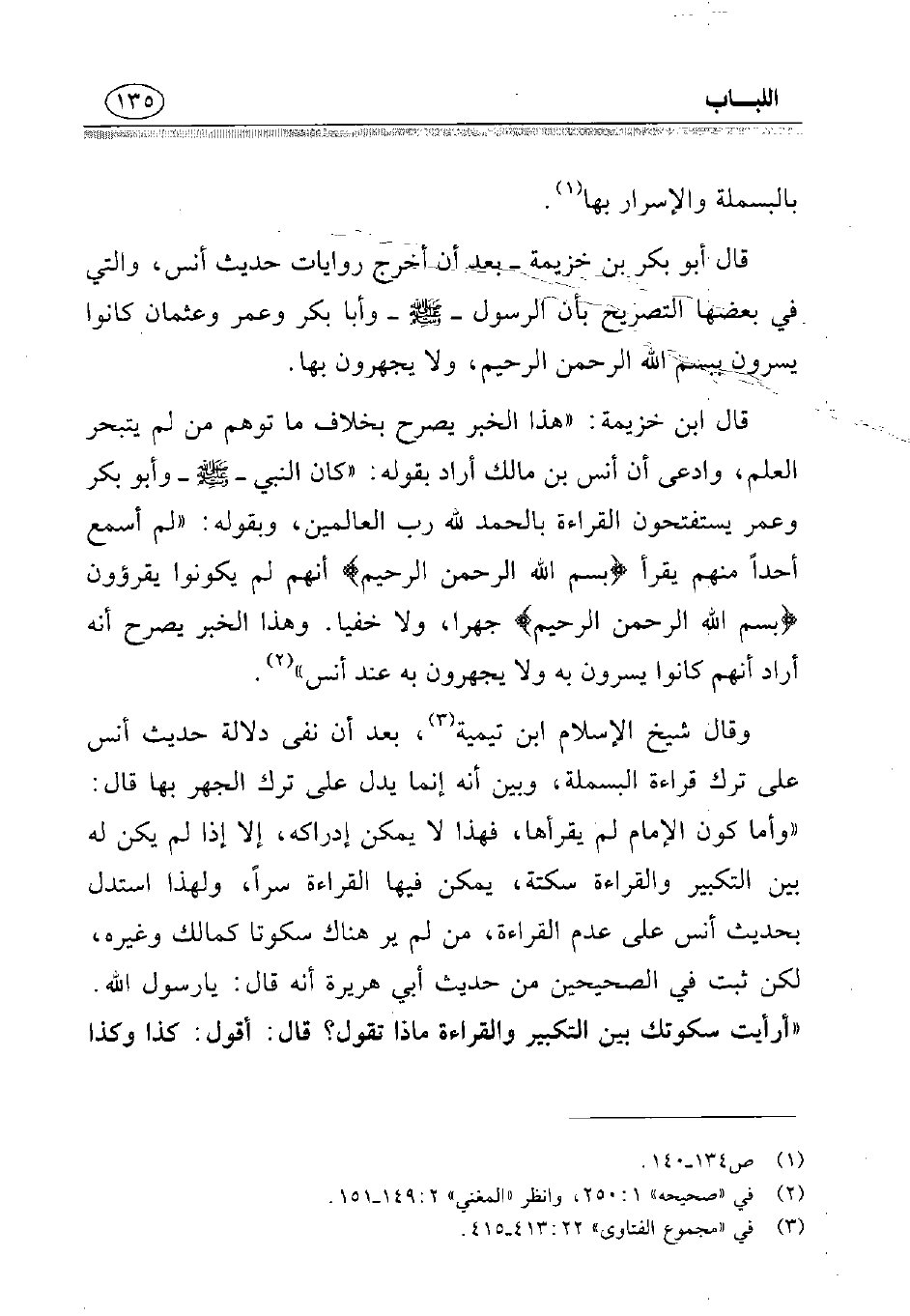 قال ابن خزيمة: «هذا الخبر يصرح بخلاف ما توهم من لم يتبحر العلم، وادعى أن أنس بن مالك أراد بقوله: «كان النبي - صلى الله عليه وسلم - وأبو بكر وعمر يستفتحون القراءة بالحمد لله رب العالمين، وبقوله: «لم أسمع أحدًا منهم يقرأ {بِسْمِ اللَّهِ الرَّحْمَنِ الرَّحِيمِ} أنهم لم يكونوا يقرؤون ... جهرا، ولا خفيا. وهذا الخبر يصرح أنه أراد أنهم كانوا يسرون به ولا يجهزون به عند أنس» (¬2).
