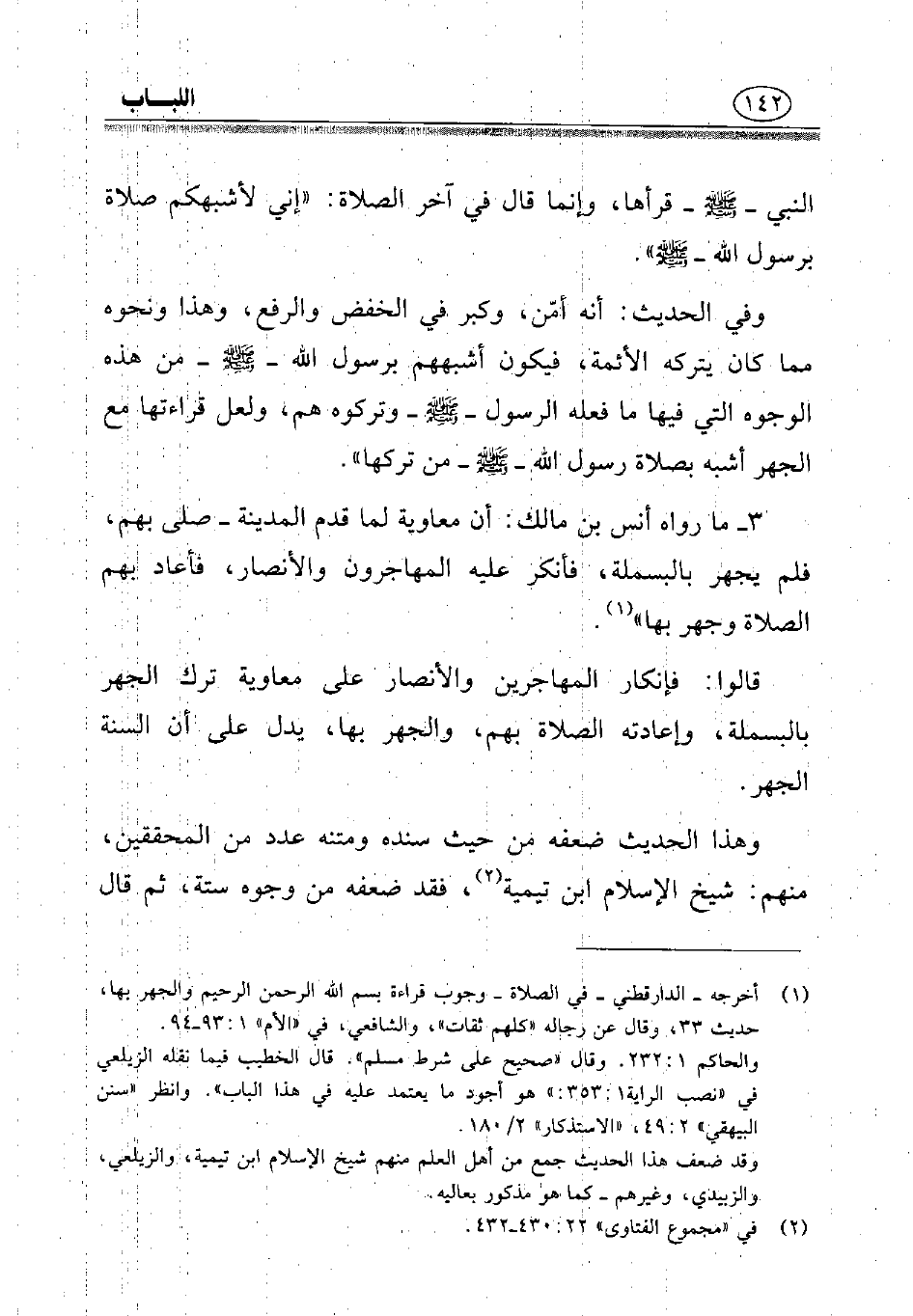 وفي الحديث: أنه أمن، وكبر في الخفض والرفع، وهذا نحوه مما كان يتركه الأئمة، فيكون أشبههم برسول الله - صلى الله عليه وسلم - من هذه الوجوه التي فيها ما فعله الرسول - صلى الله عليه وسلم - وتركوه هم، ولعل قراءتها مع الجهر أشبه بصلاة رسول الله - صلى الله عليه وسلم - من تركها».