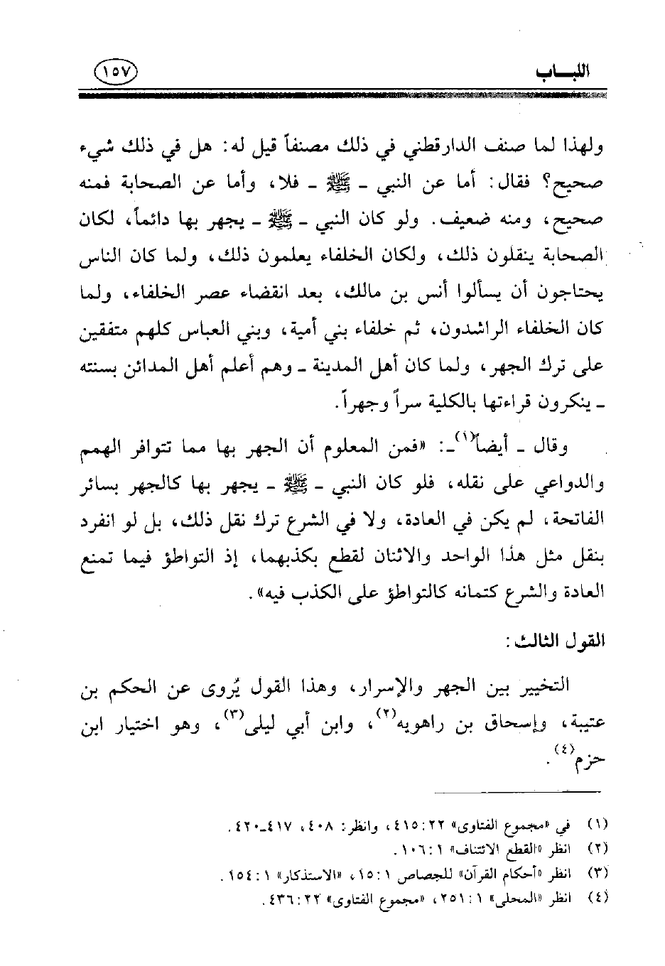 ولهذا لما صنف الدارقطني في ذلك مصنفًا قيل له: هل في ذلك شيء صحيح؟ فقال: أما عن النبي - صلى الله عليه وسلم - فلا، وأما عن الصحابة فمنه صحيح، ومنه ضعيف. ولو كان النبي - صلى الله عليه وسلم - يجهر بها دائمًا، لكان الصحابة ينقلون ذلك، ولكان الخلفاء يعلمون ذلك، ولما كان الناس يحتاجون أن يسألوا أنس بن مالك، بعد انقضاء عصر الخلفاء، ولما كان الخلفاء الراشدون، ثم خلفاء بني أمية، وبني العباس كلهم متفقين على ترك الجهر، ولما كان أهل المدينة- وهم أعلم أهل المدائن بسنته- ينكرون قراءتها بالكلية سرًا وجهرًا.