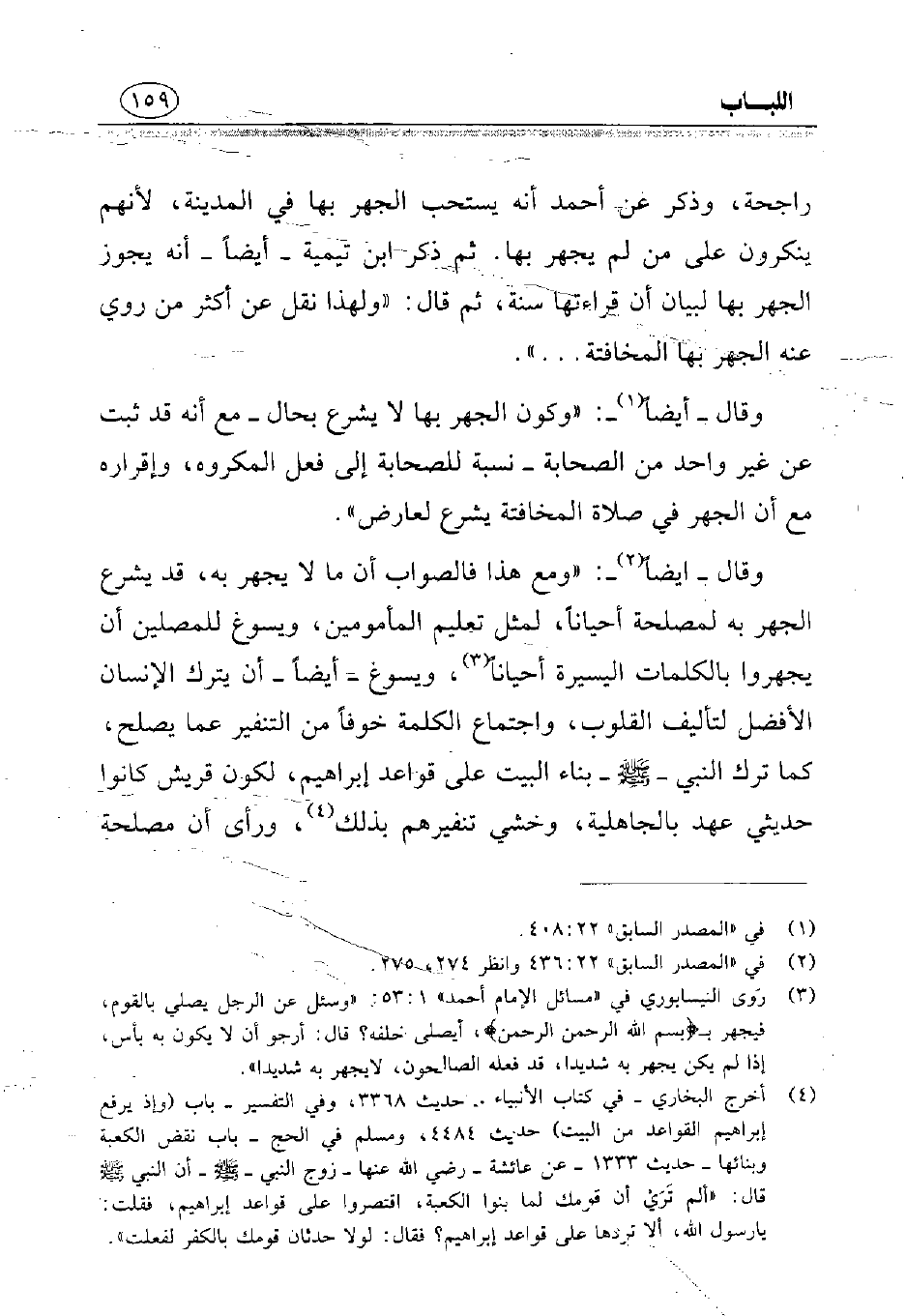 (¬4) أخرج البخاري - في كتاب الأنبياء- حديث 3368، وفي التفسير- باب (وإذ يرفع إبراهيم القواعد من البيت) حديث 4484، ومسلم في الحج- باب نقض الكعبة وبنائها- حديث 1333 - عن عائشة- رضي الله عنها- زوج النبي - صلى الله عليه وسلم - أن النبي - صلى الله عليه وسلم - قال: «ألم تري أن قومك لما بنوا الكعبة, اقتصروا على قواعد إبراهيم, فقلت, يارسول الله, ألا تردها على قواعد إبراهيم؟ فقال: لولا حدثان قومك بالكفر لفعلت».