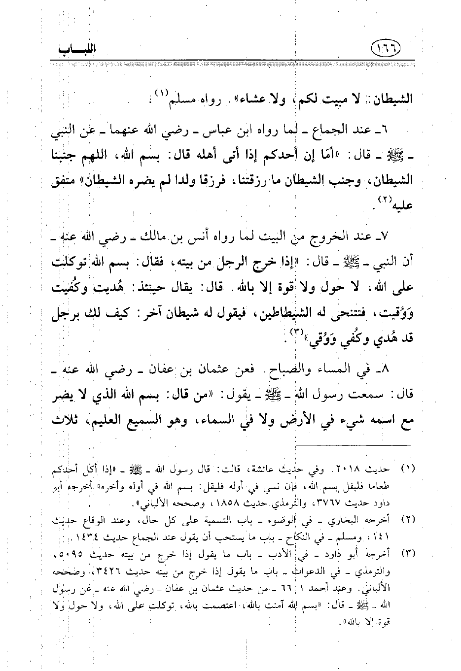 (¬2) أخرجه البخاري- في الوضوء- باب التسمية على كل حال، وعند الوقاع حديث 141، ومسلم- في النكاح- باب ما يستحب أن يقول عند الجماع حديث 1434.