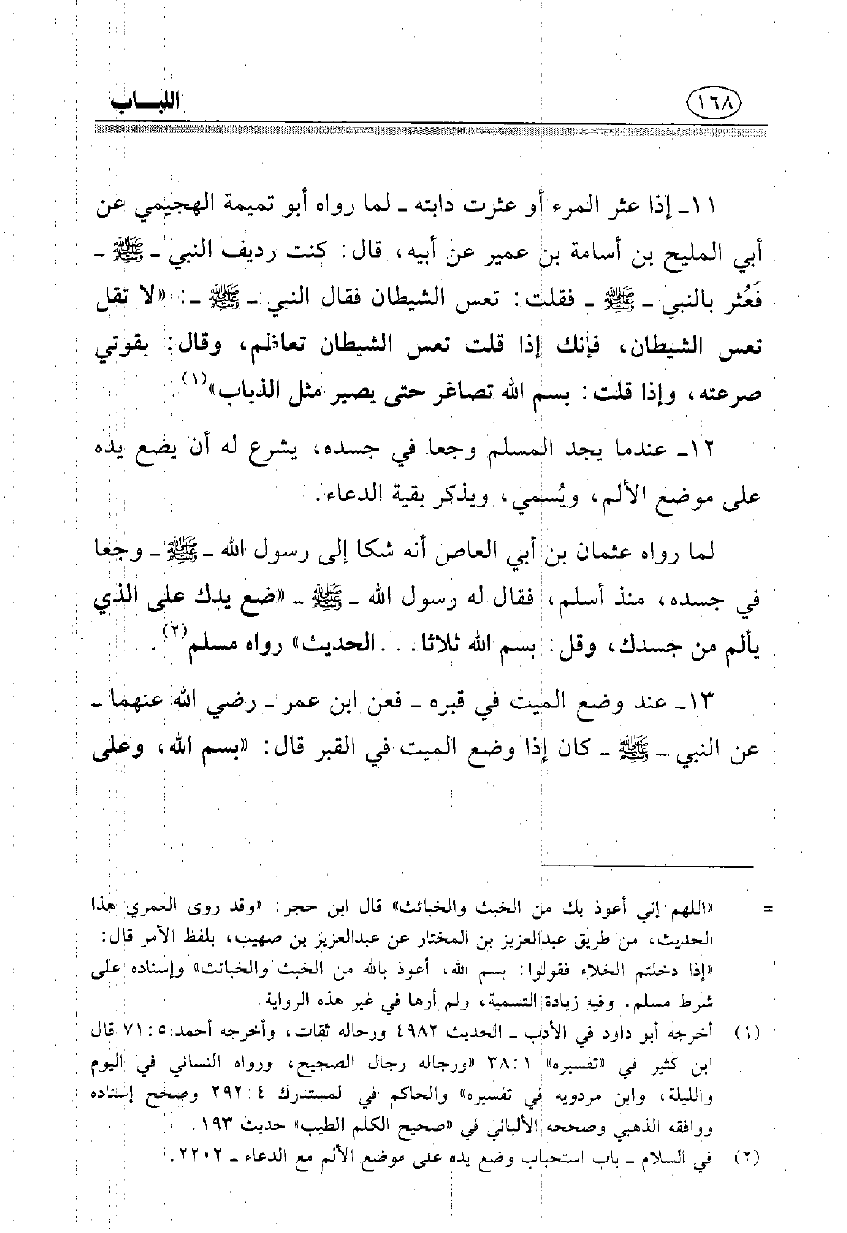 11 - إذا عثر المرء أو عثرت دابته- لما رواه أبو تميمة الهجيمي عن أبي المليح بن أسامة بن عمير عن أبيه، قال: كنت رديف النبي - صلى الله عليه وسلم - فعثر بالنبي - صلى الله عليه وسلم - فقلت: تعس الشيطان فقال النبي - صلى الله عليه وسلم -: «لا تقل تعس الشيطان، فإنك إذا قلت تعس الشيطان تعاظم، وقال: بقوتي صرعته، وإذا قلت: بسم الله تصاغر حتى يصير مثل الذباب» (¬1).