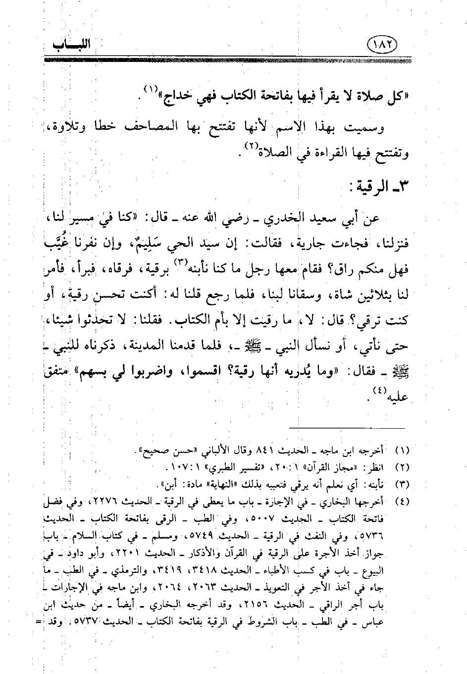 (¬4) أخرجه البخاري- في الإجازة- باب ما يعطى في الرقية- الحديث 2276, وفي فضل فاتحة الكتاب- الحديث 5007, وفي الطب- الرقى بفاتحة الكتاب- الحديث 5736, وفي النفث في الرقية- الحديث 5749, ومسلم- في كتاب السلام- باب جواز أخذ الأجرة على الرقية في القرآن والأذكار- الحديث 2201, وأبو داود- في البيوع- باب في كسب الأطباء- الحديث 3418, 3419, والترمذي- في الطب- ما جاء في أخذ الأجر في التعويذ- الحديث 2063, 2064, وابن ماجه الإجارات- باب أجر الراقي- الحديث 2156, وقد أخرجه البخاري- أيضًا- من حديث ابن عباس- في الطب- باب الشروط في الرقية بفاتحة الكتاب- الحديث 5737. وقد ذكر الحافظ ابن حجر أن القصة واحدة, وقعت لهم مع الذي لدغ «فتح الباري» 4: 455, 10: 199.