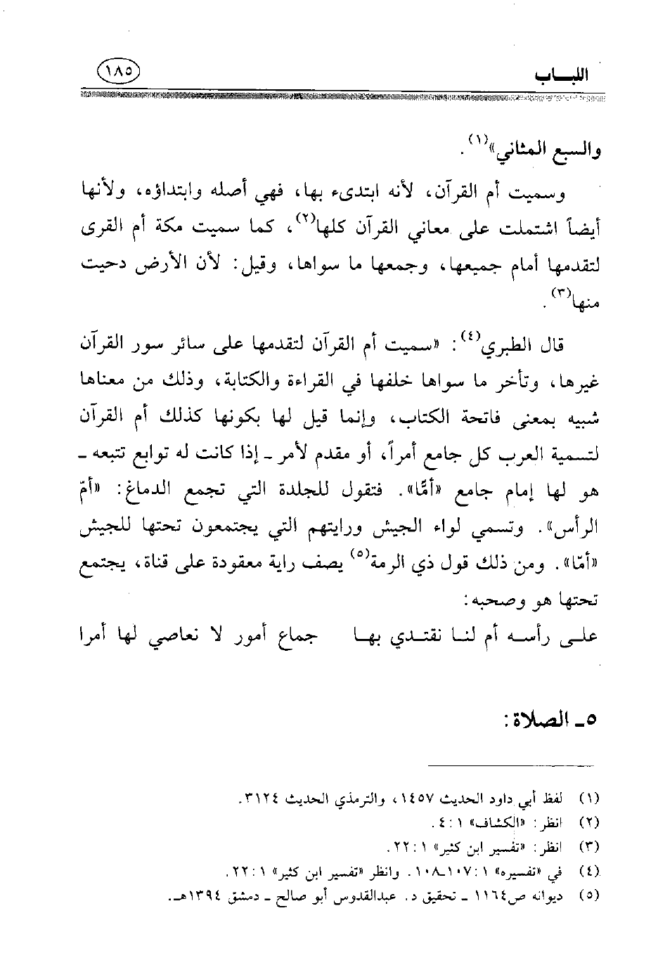 قال الطبري (¬4): «سميت أم القرآن لتقدمها على سائر سور القرآن غيرها, وتأخر ما سواها في القراءة والكتابة, وذلك من معناها شبيه بمعنى فاتحة الكتاب, وإنما قيل لها بكونها كذلك أم القرآن لتسمية العرب كل جامع أمرًا, أو مقدم لأمر - إذا كانت له توابع تتبعه- هو لها إمام جامع «أمُّا». فتقول للجلدة التي تجمع الدماغ: «أمّ الرأس «. وتسمى لواء الجيش ورايتهم التي يجتمعون تحتها للجيش «أمًّا». ومن ذلك قول ذي الرمة (¬5) يصف راية معقودة على قناة, يجتمع تحتها هو وصحبه:
