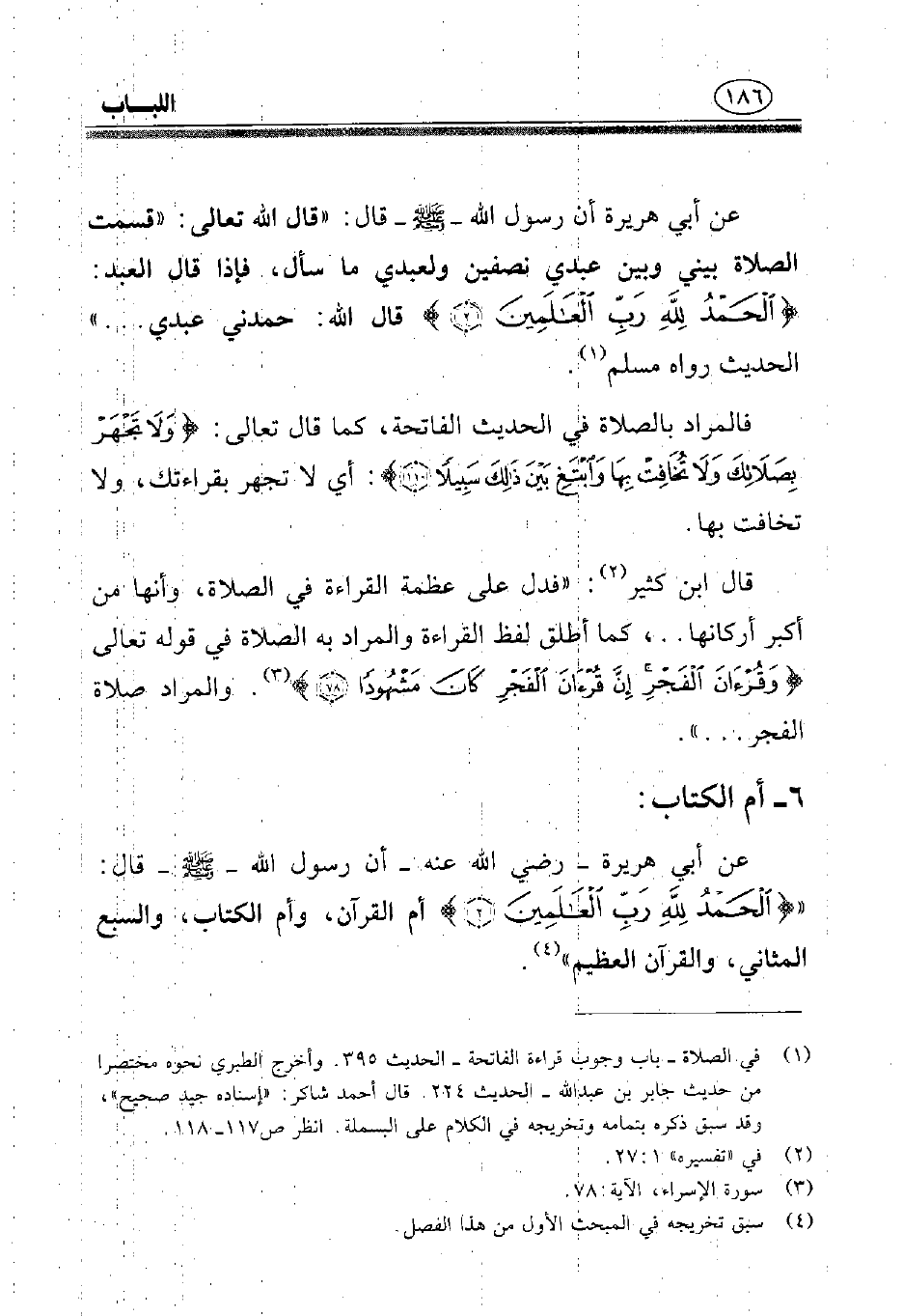 عن أبى هريرة - رضي الله عنه - أن رسول الله - صلى الله عليه وسلم - قال: «{الْحَمْدُ لِلَّهِ رَبِّ الْعَالَمِينَ} أم القرآن, وأم الكتاب, والسبع المثاني, والقرآن العظيم» (¬4).